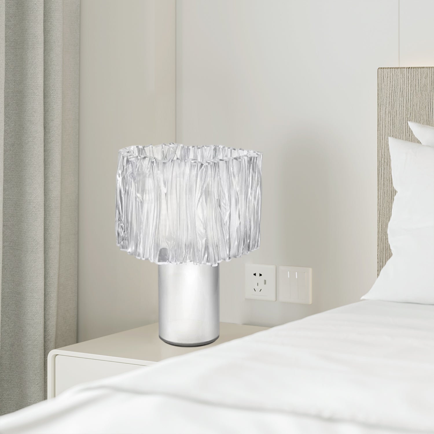 The Accordion Shade Table Lamp features a cylindrical base with a pleated shade design. Its soft light creates a comfortable atmosphere, making it suitable for bedrooms, living rooms, or study areas. The neutral style allows it to blend with different interior settings.