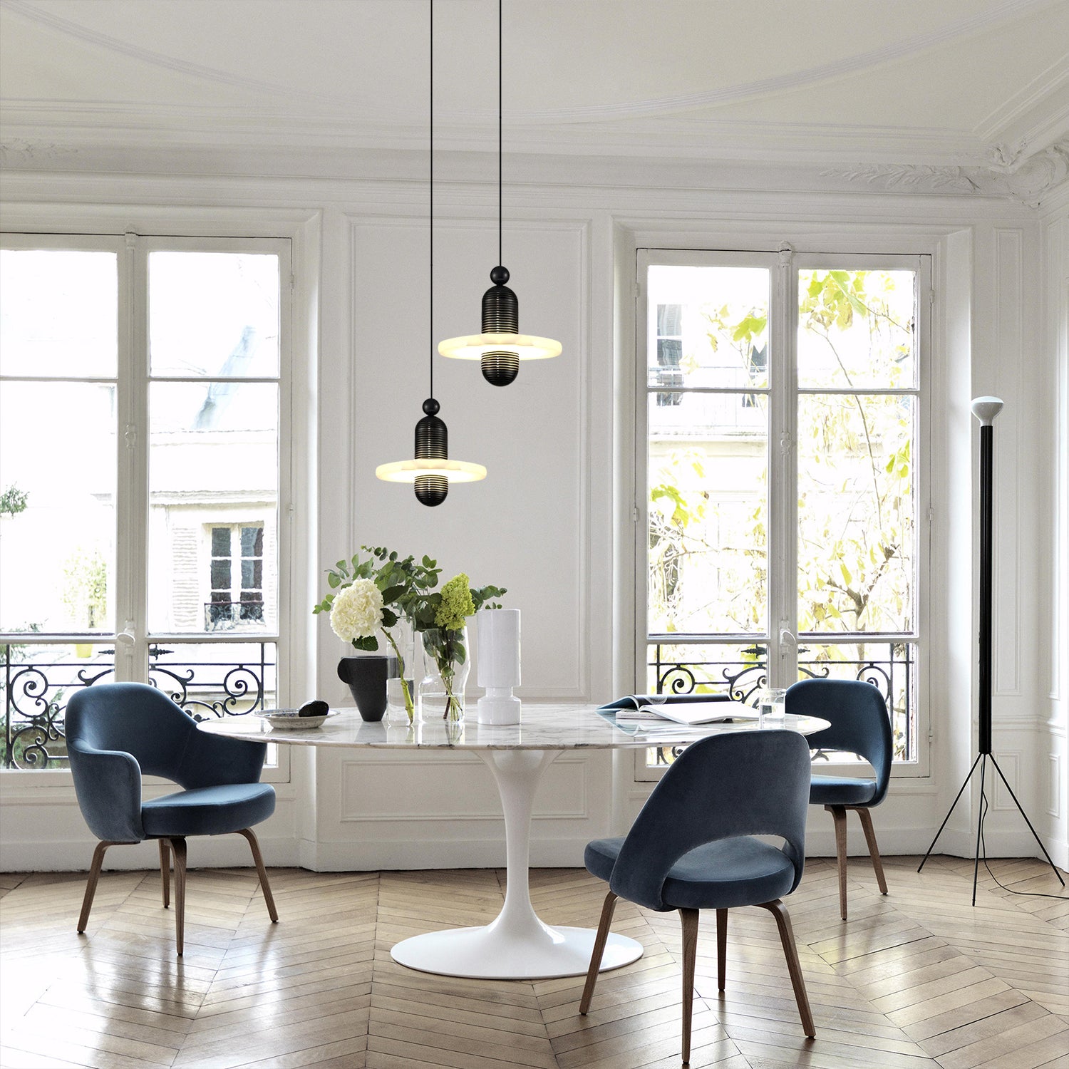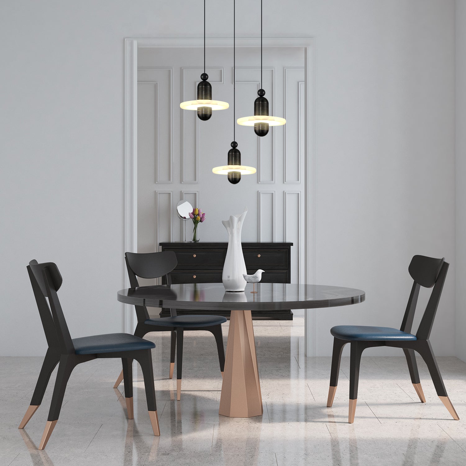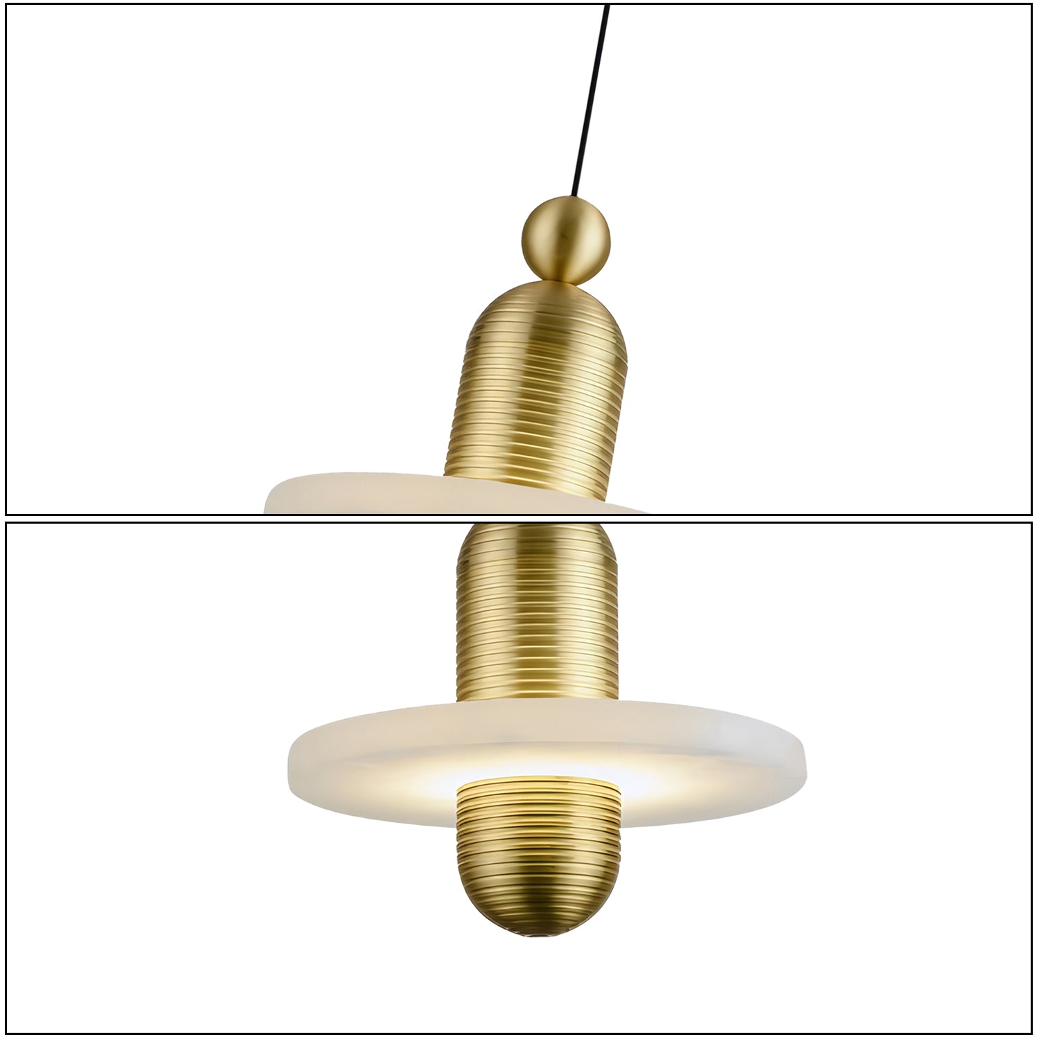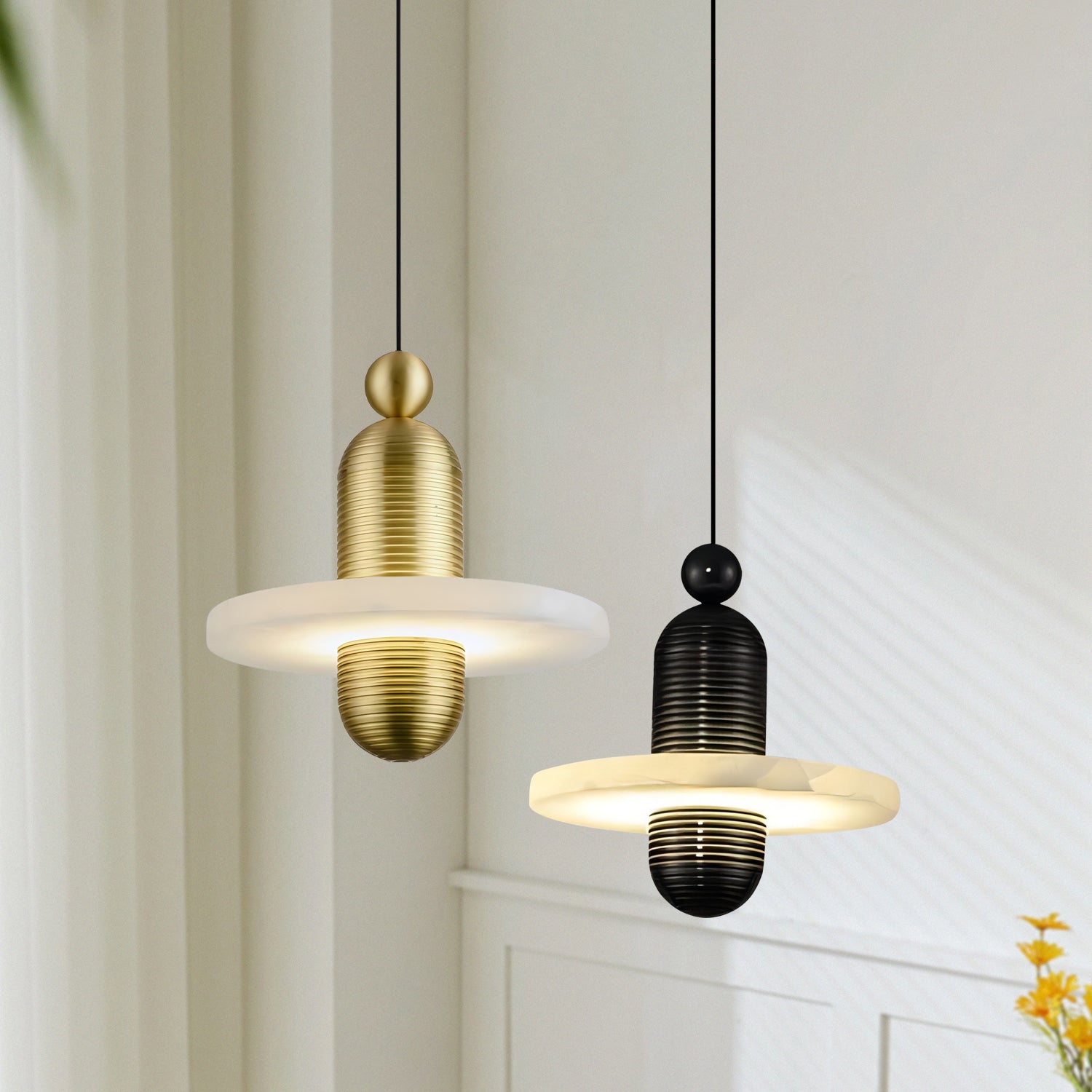 The Alabaster Disc Pendant Lamp combines a rounded alabaster shade with a ribbed metal body in brass or black finishes. The natural alabaster creates a soft, diffused light, while the disc form gives the fixture a balanced appearance. Designed for ceiling mounting, this pendant lamp works well above dining tables, in living rooms, or as an accent light in bedrooms. Its simple materials and neutral colors make it versatile for different interior styles.