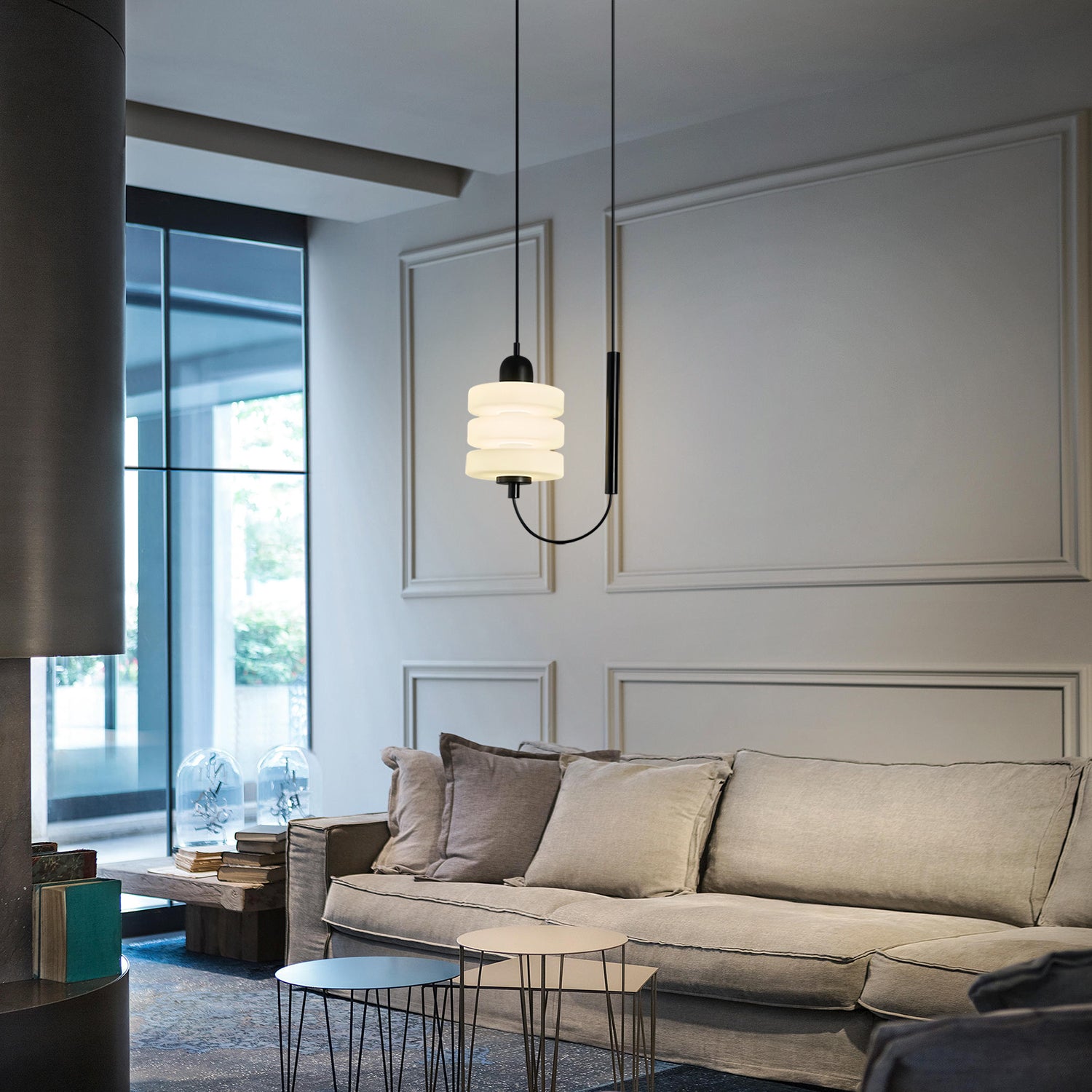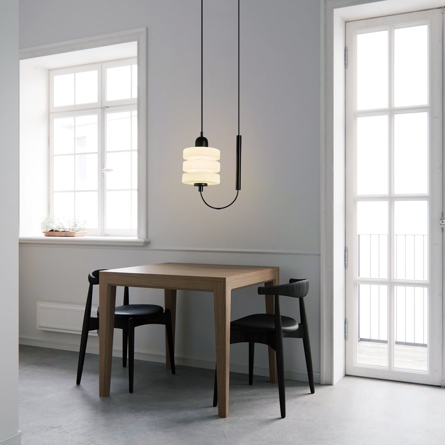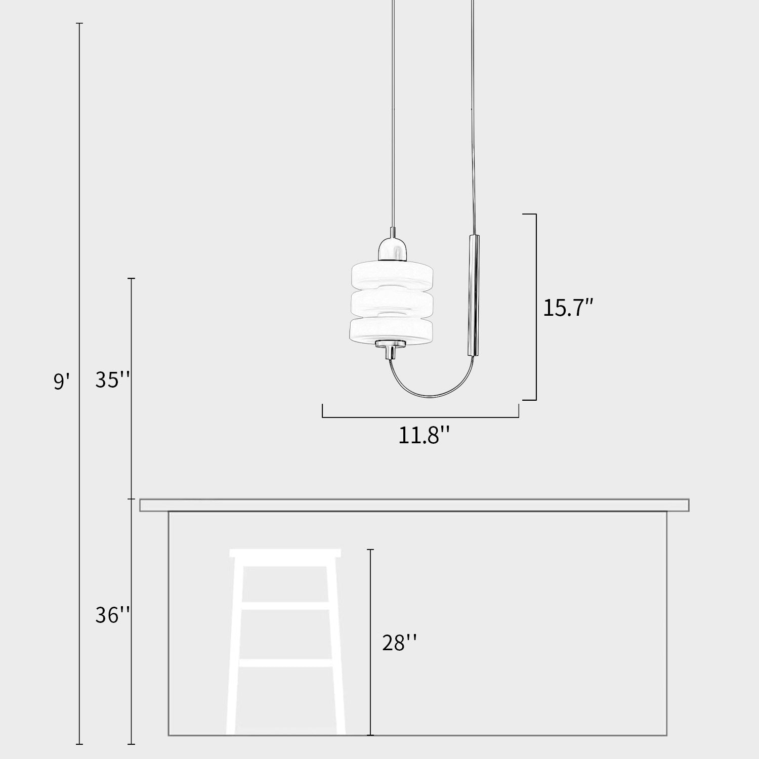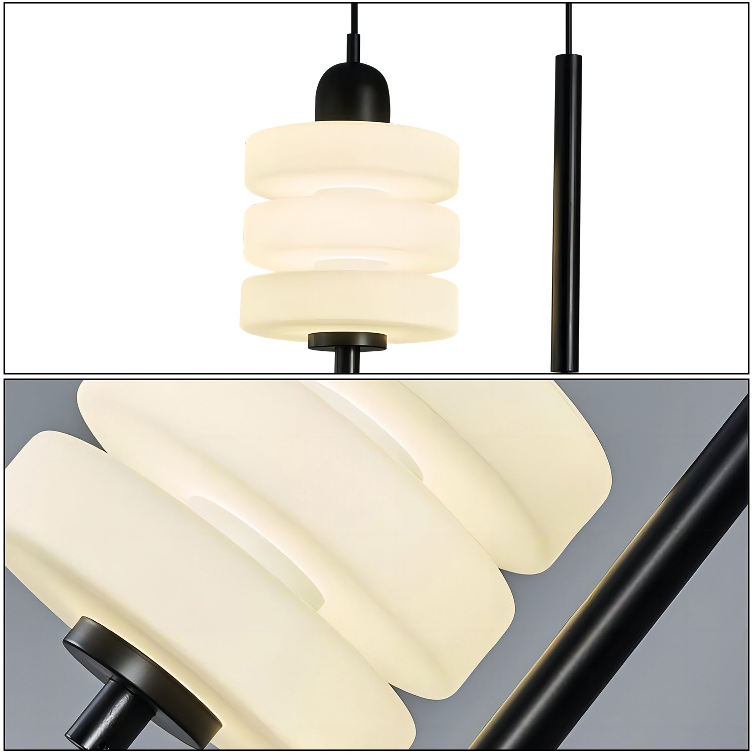 Mounted on a black metal rod and ceiling canopy with coordinated hardware, this fixture is intended for installation over kitchen islands, dining tables, or entryways. The mineral composite shades exhibit natural veining variations characteristic of the material.