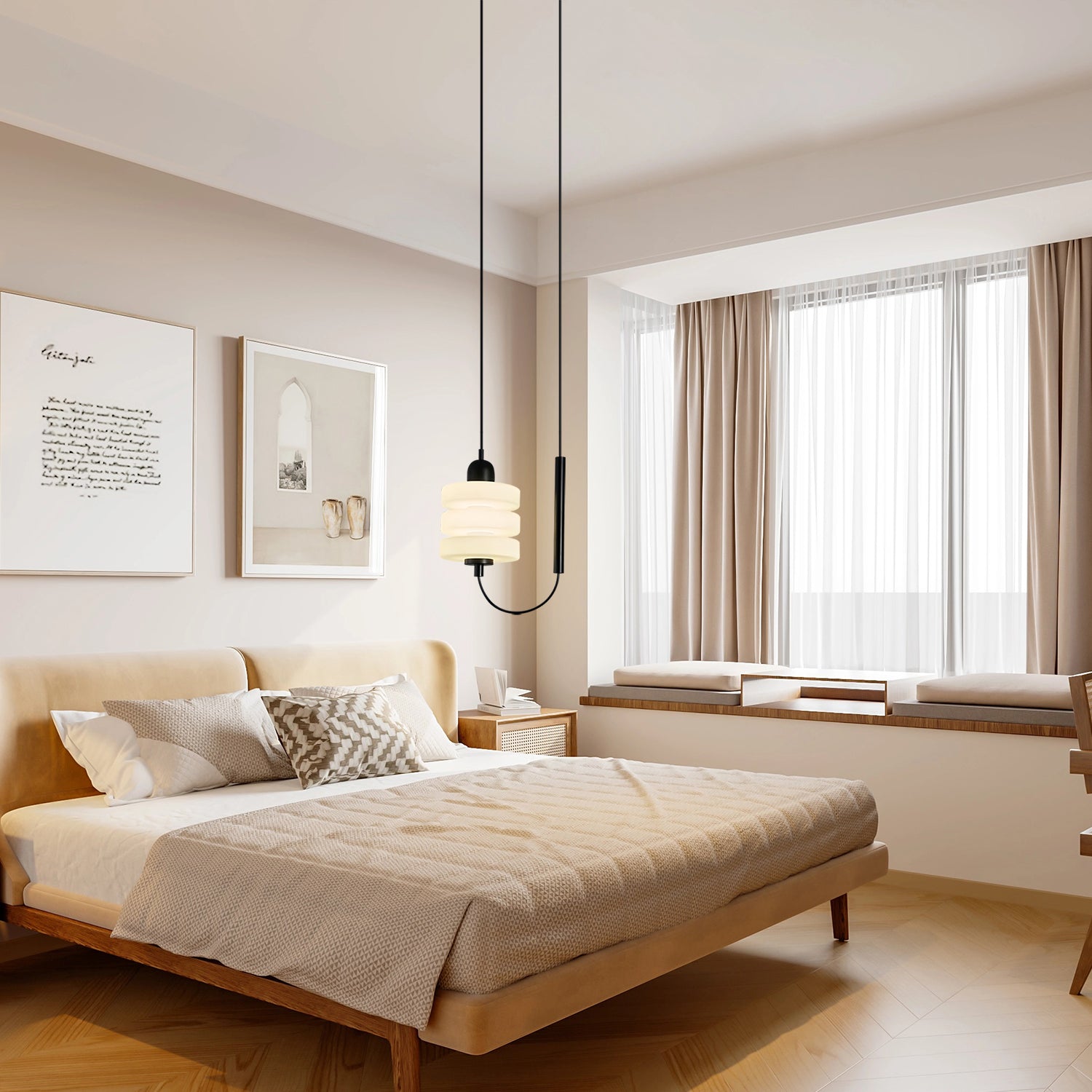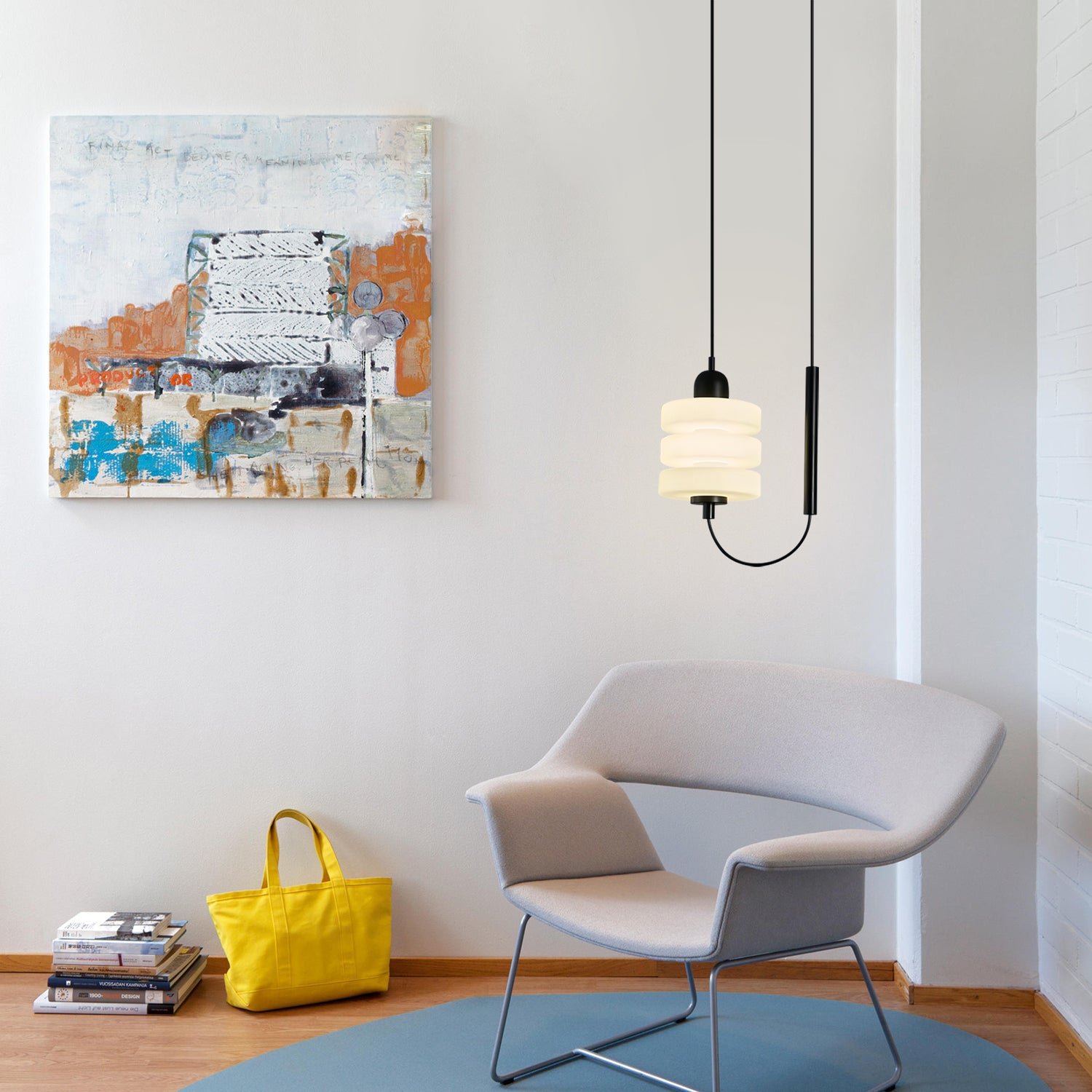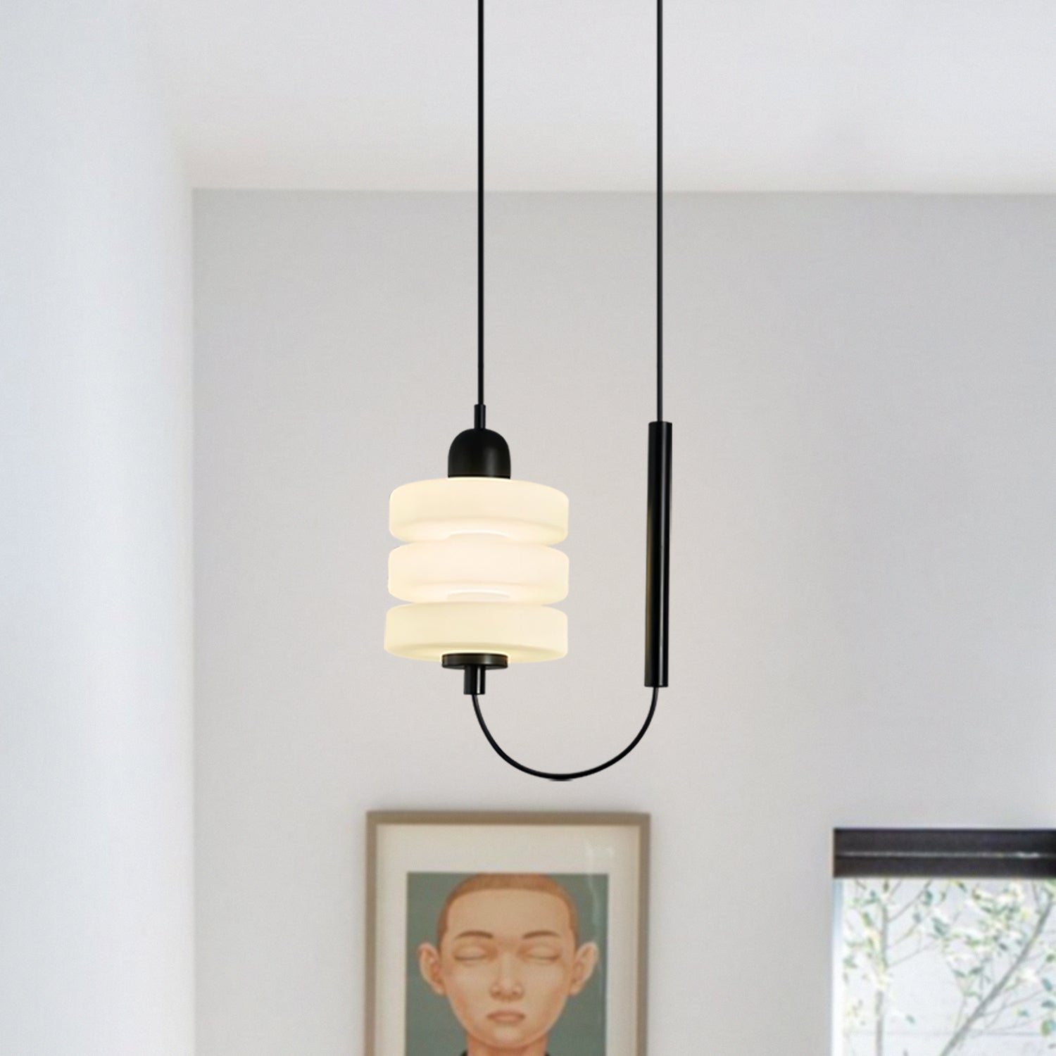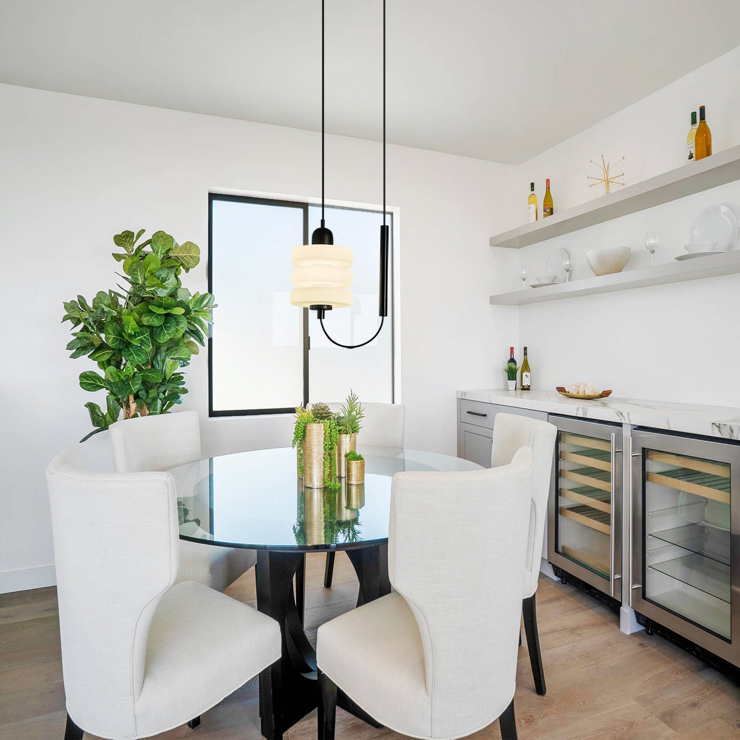 Mounted on a black metal rod and ceiling canopy with coordinated hardware, this fixture is intended for installation over kitchen islands, dining tables, or entryways. The mineral composite shades exhibit natural veining variations characteristic of the material.