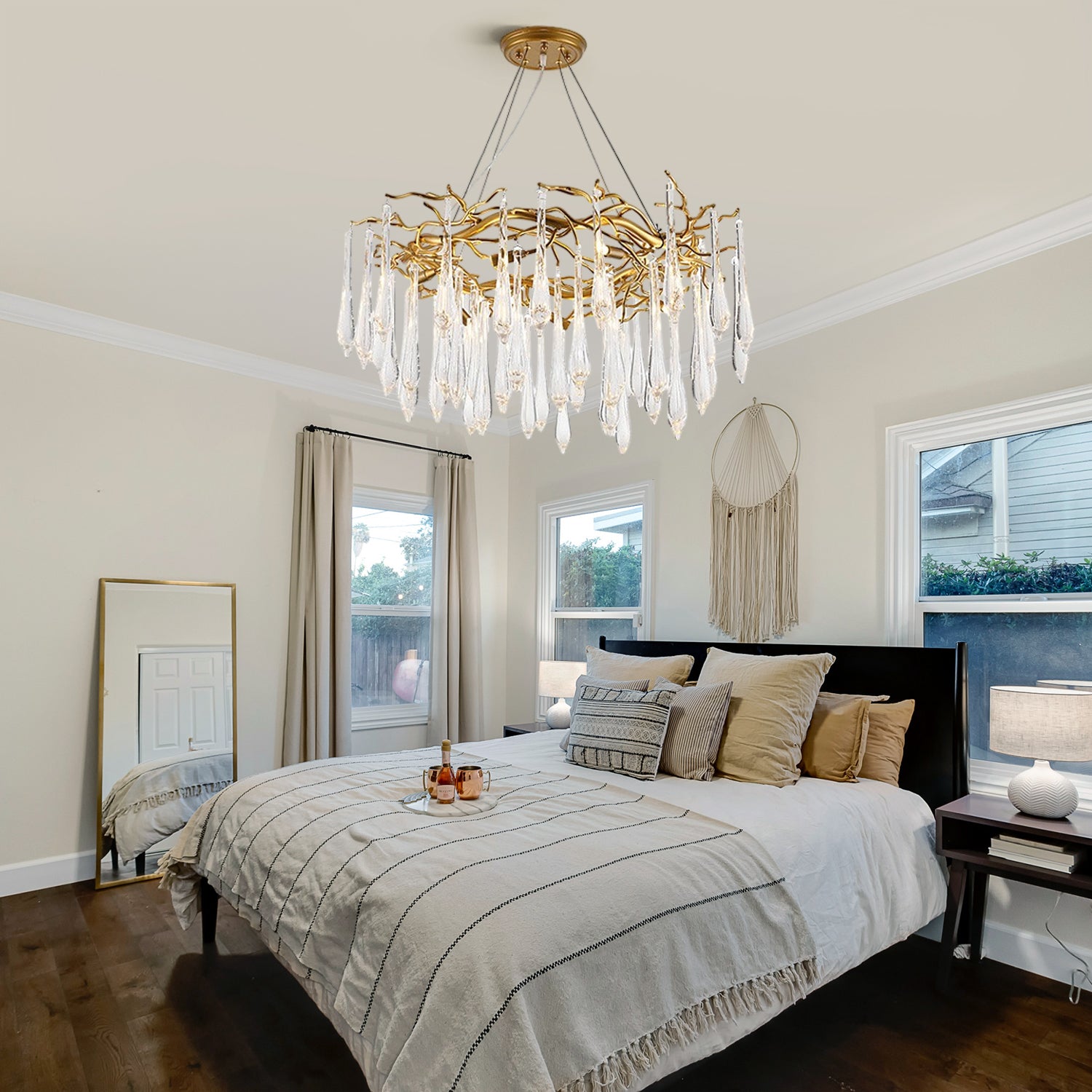 The Brass Round Teardrop Chandelier features a circular brass-toned frame with suspended glass teardrop details. Its balanced arrangement makes it suitable for dining areas, living rooms, or entryways. Made of metal and glass, the fixture provides a refined and structured appearance.