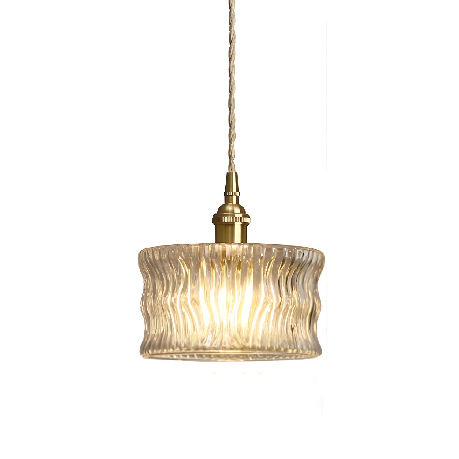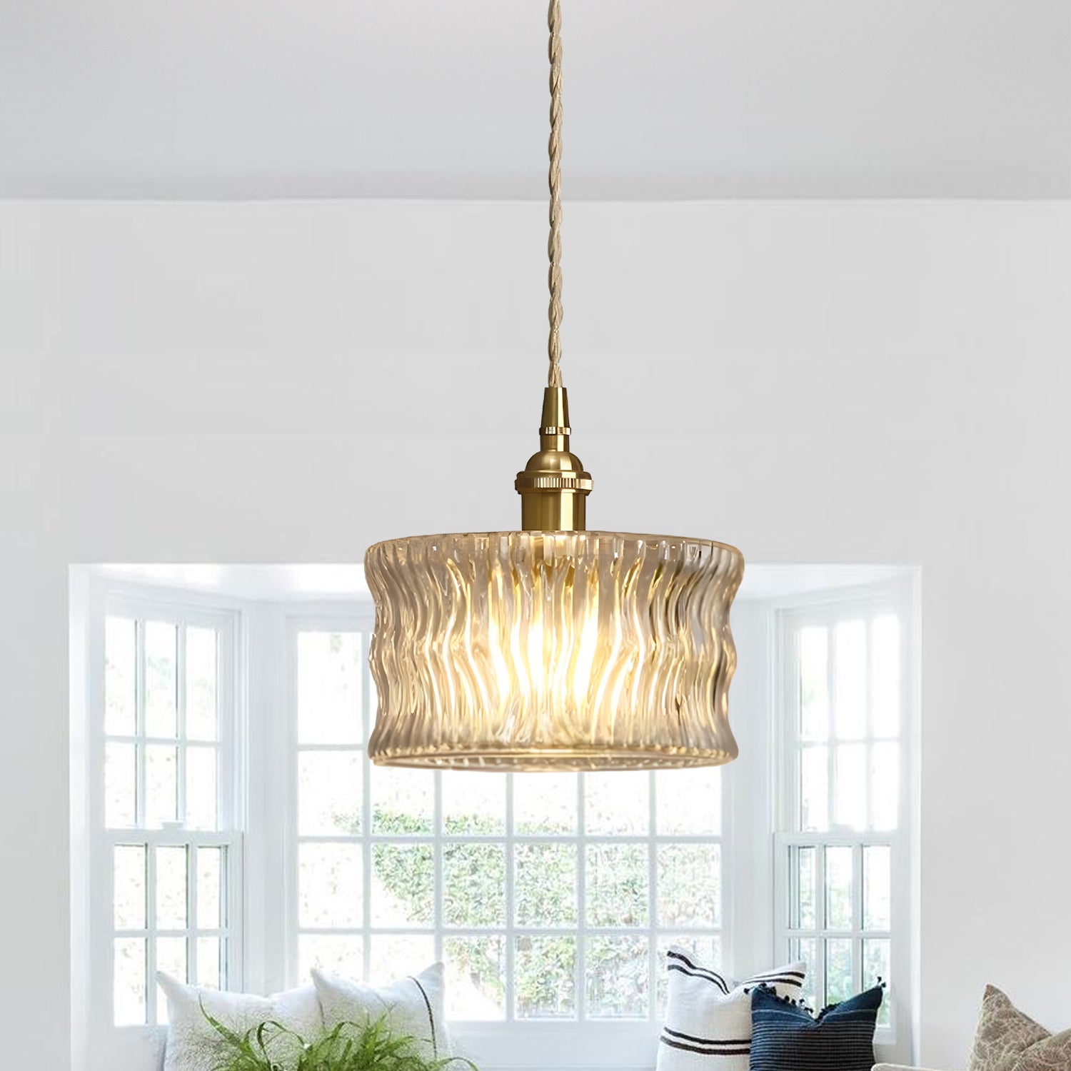 This pendant light features a copper lamp head with a transparent glass shade. Its simple design works well in various spaces such as dining rooms, living areas, or bedrooms. The combination of metal and glass creates a classic look that can complement both modern and traditional interiors.