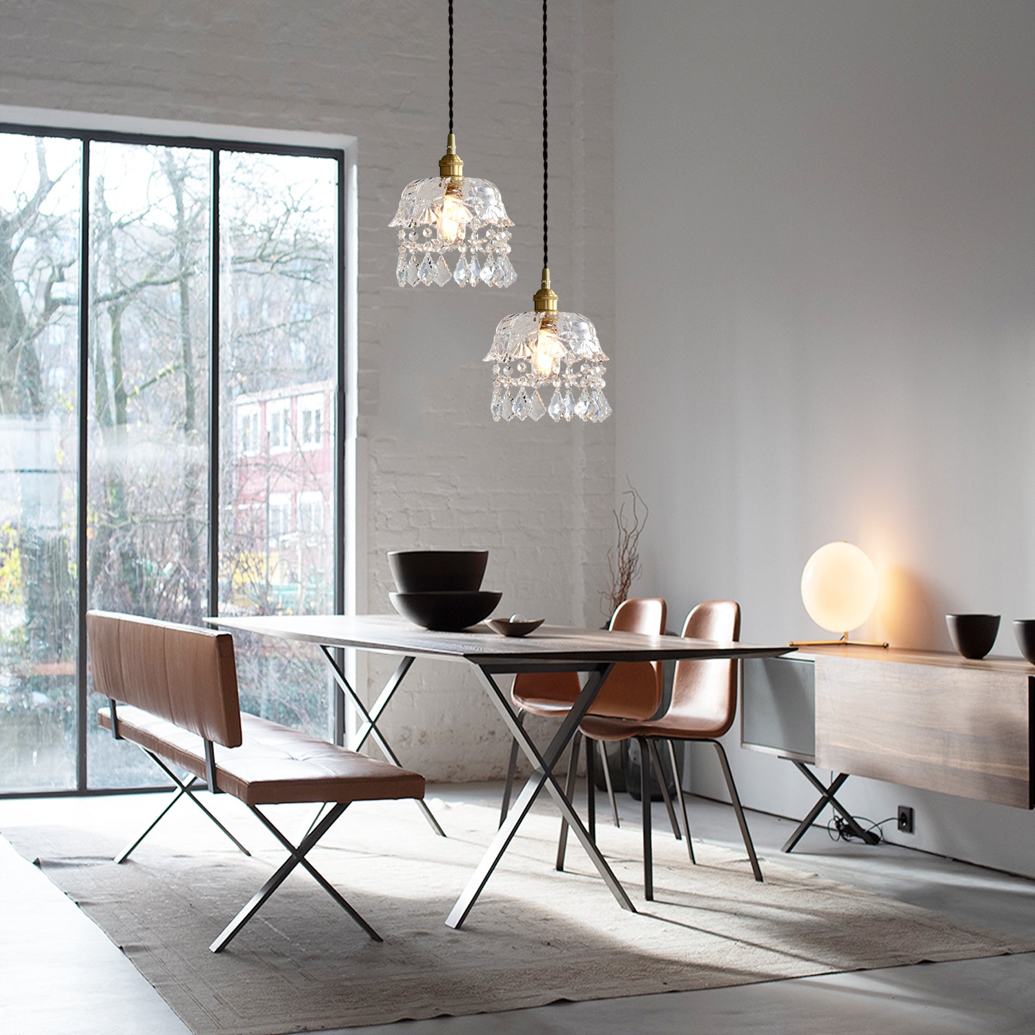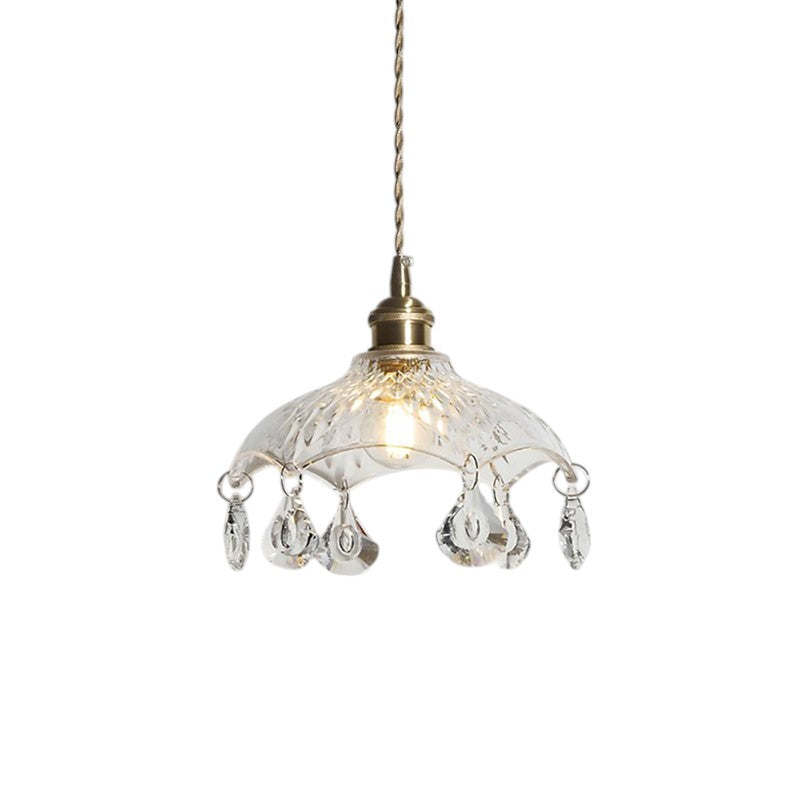 The Daffodils Pendant Light has a copper lamp head paired with a translucent glass shade. Its shape is influenced by vintage design, making it suitable for dining rooms, living areas, or entryways. The copper construction provides a sturdy build, and the light serves as both functional illumination and a decorative element.