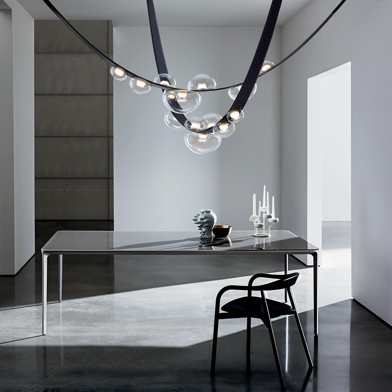 The Dewdrop Glass Chandelier features a circular frame with suspended glass globes that resemble dewdrops. The glass shades provide a soft diffusion of light, creating a balanced atmosphere. This ceiling fixture is suitable for dining rooms, living areas, or other indoor spaces and coordinates with different interior styles.