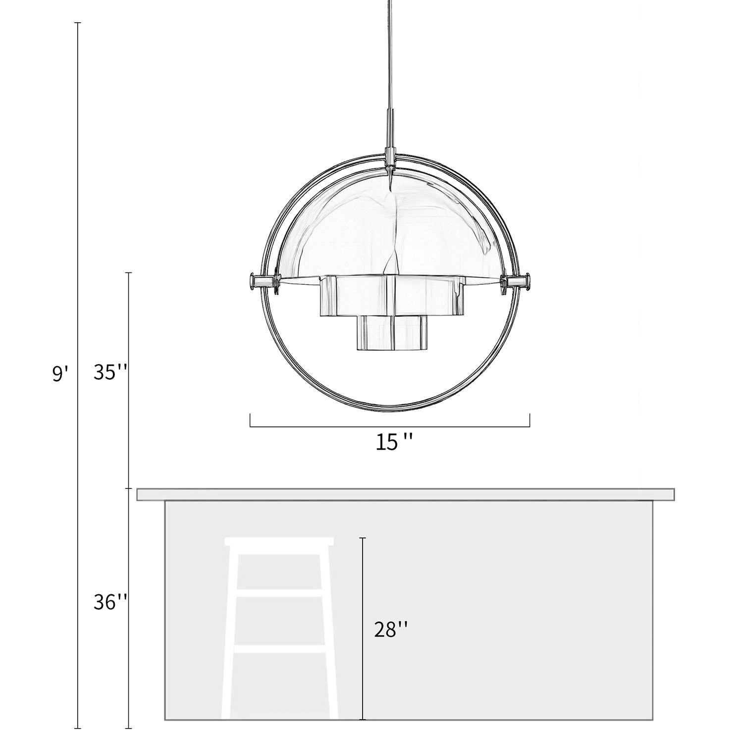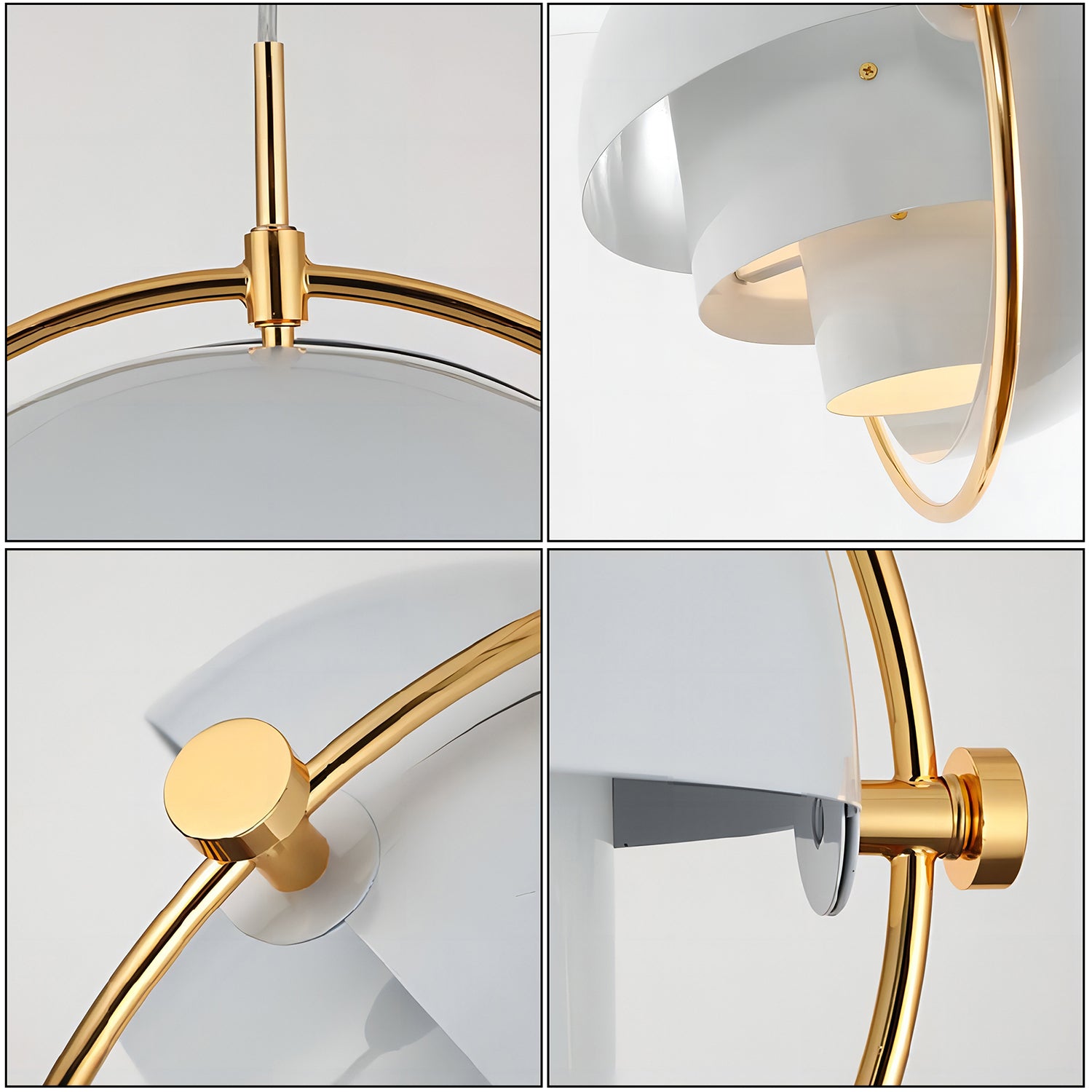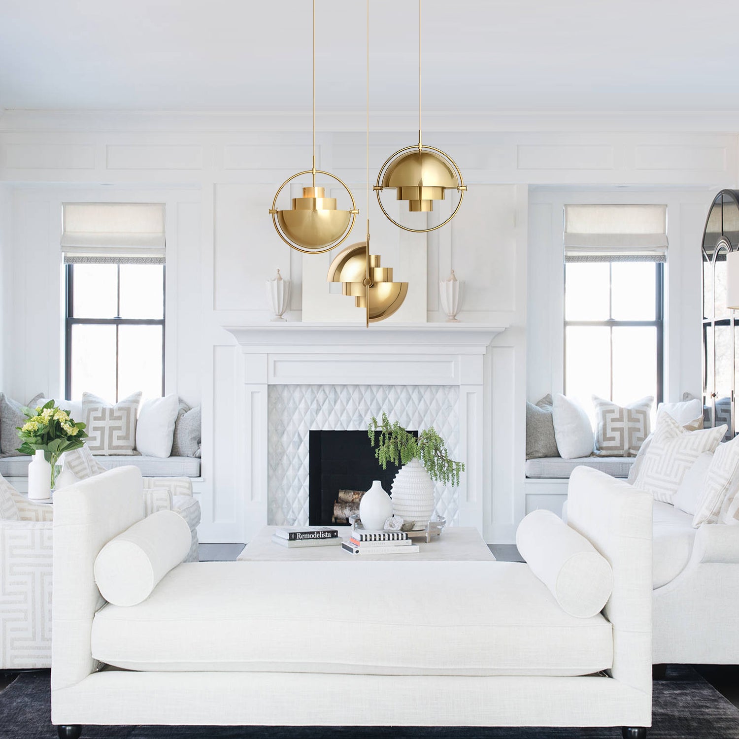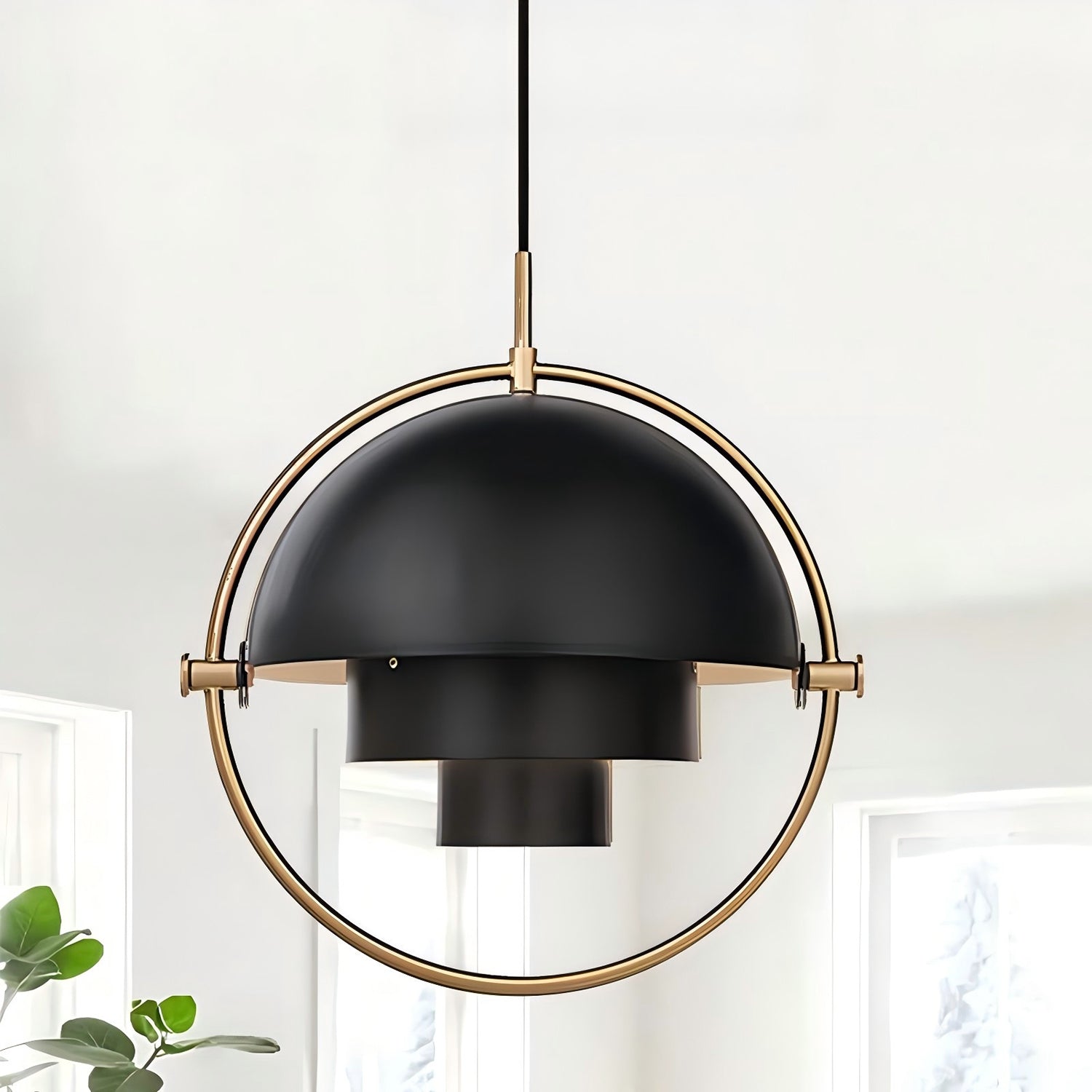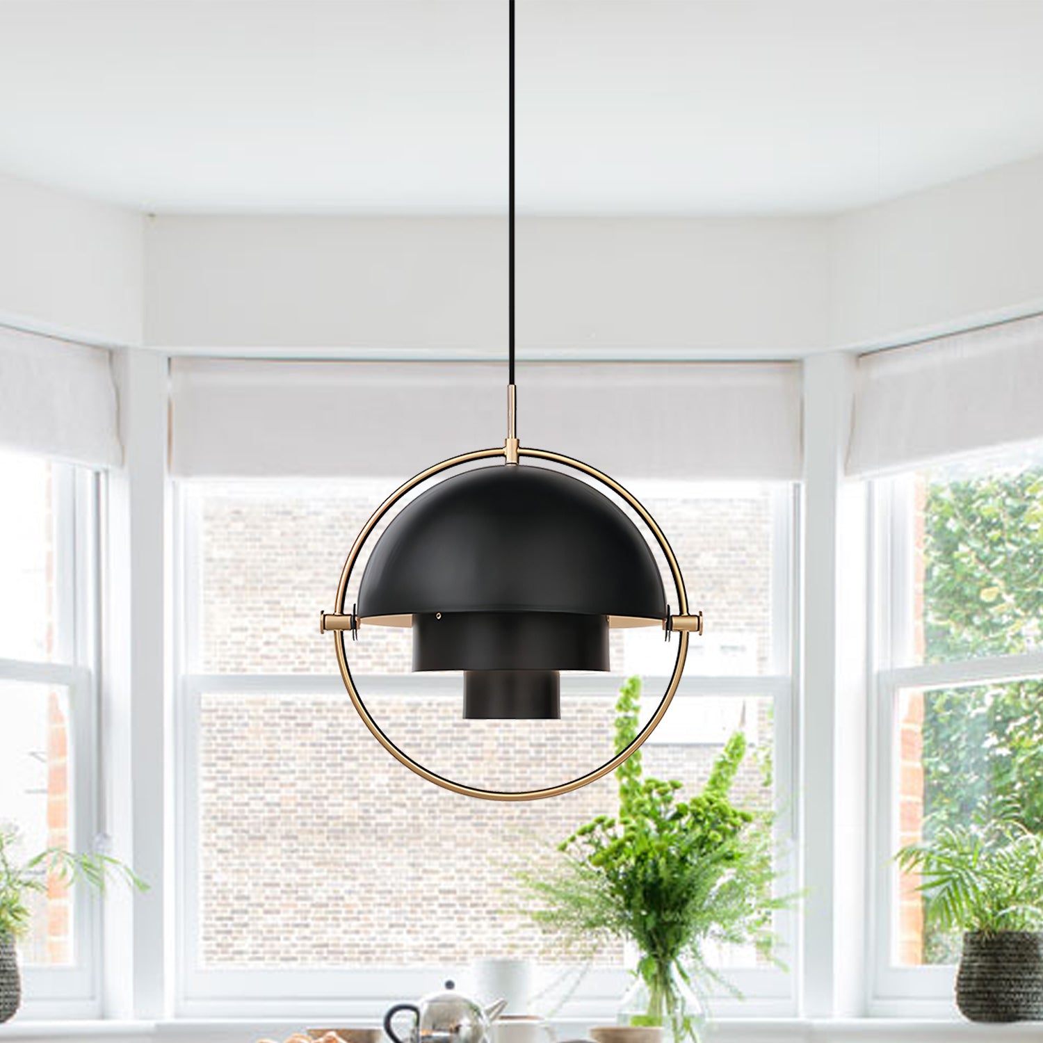 Dislocation Ball Pendant Lamp was designed by Danish designer in 1972. The design features a unique and playful shade, with two cylindrical shades laying the foundation, with a half spherical shade anchored by the bottom metal, culminating in a versatile and iconic design.