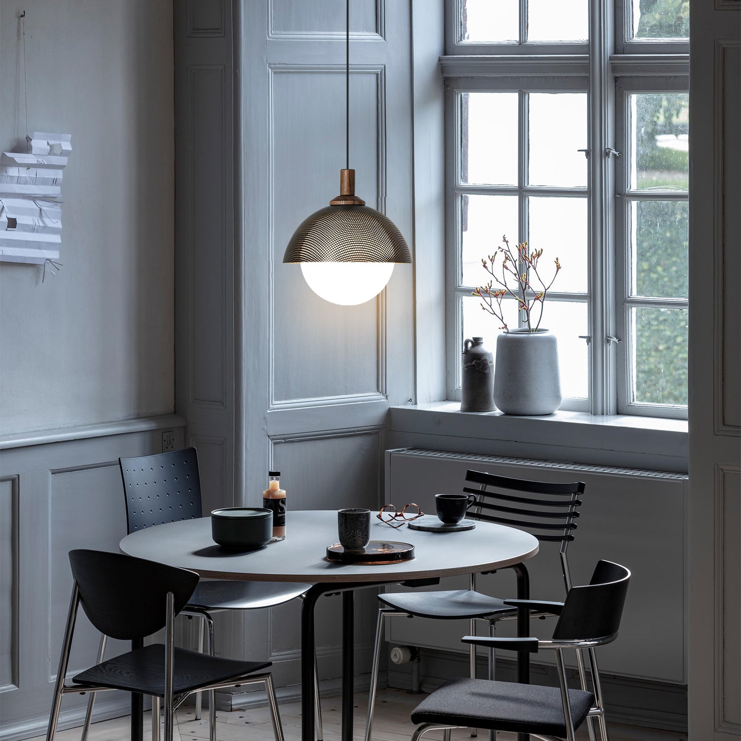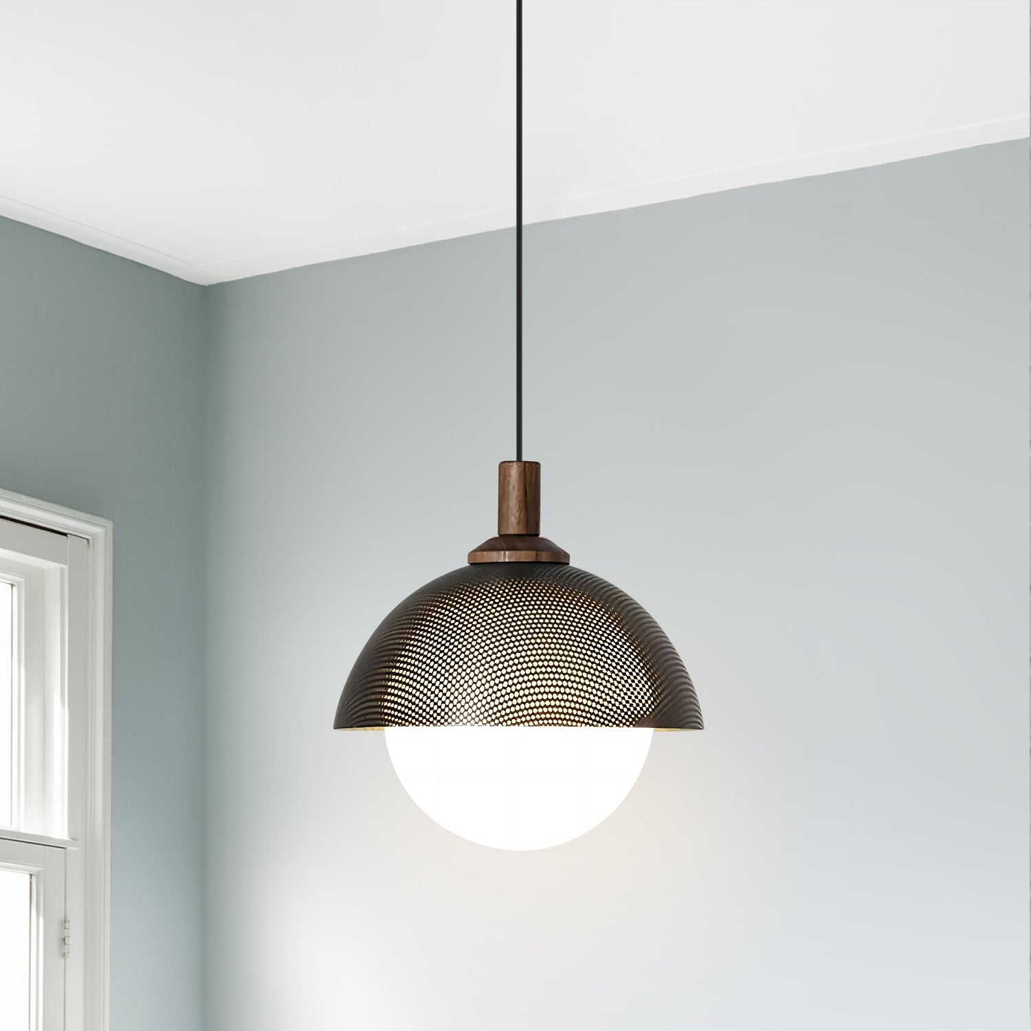 The Dome Perforated Pendant Light features a dome-shaped upper shade with a perforated pattern and a smooth glass globe beneath. The perforated section allows light to pass through in a subtle way, complementing the diffused illumination from the glass sphere. Designed for ceiling suspension, this pendant light is suitable for use in various indoor spaces.