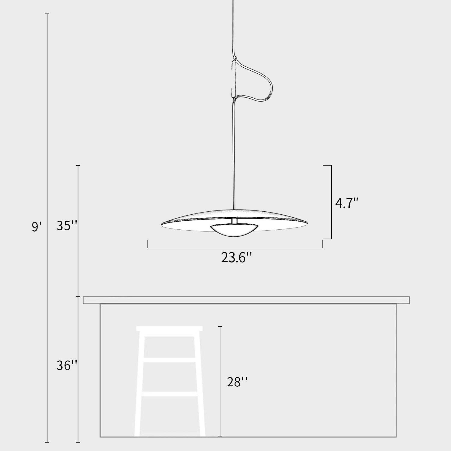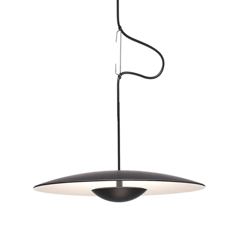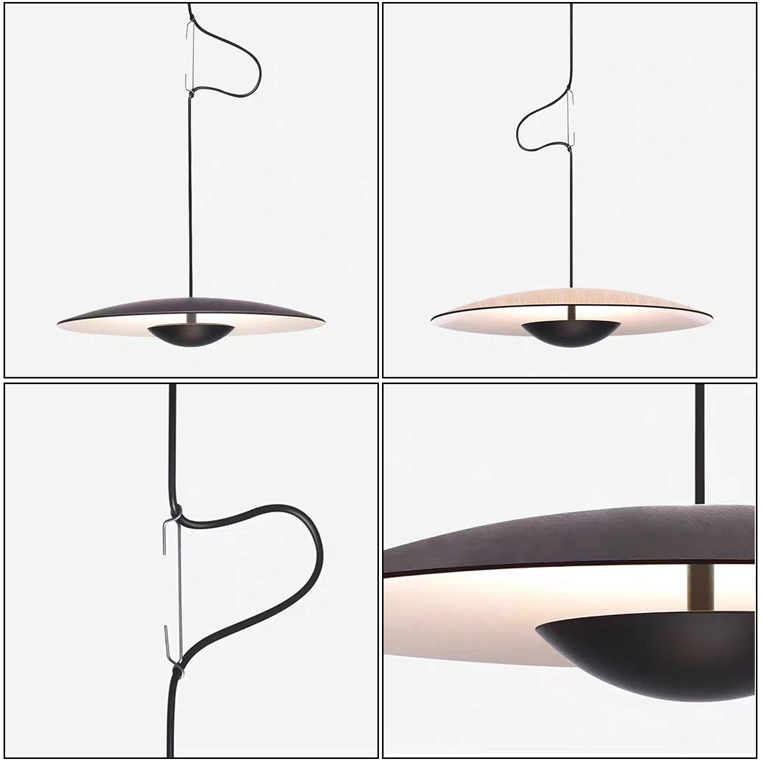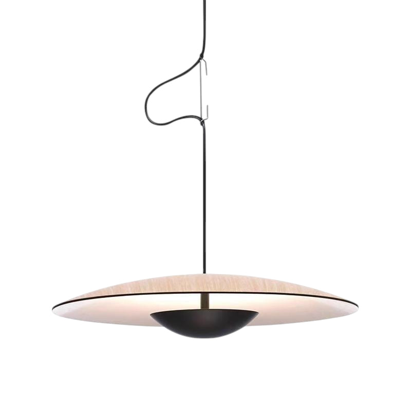 The Ginger Wood Pendant features a flying saucer design, showcasing a lampshade with a refined and natural wood grain pattern that exudes understated elegance.