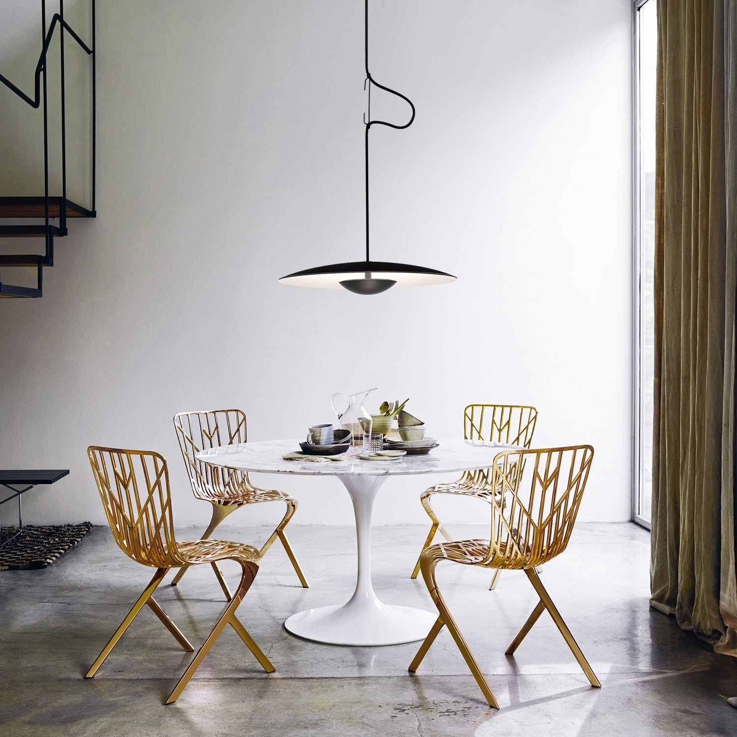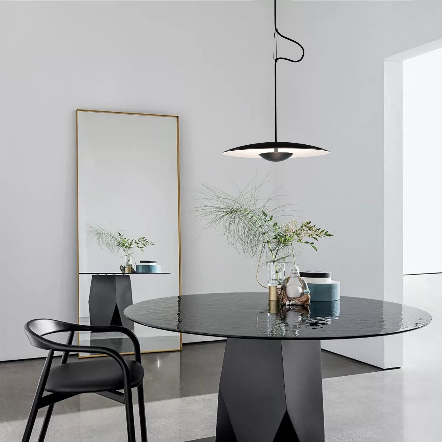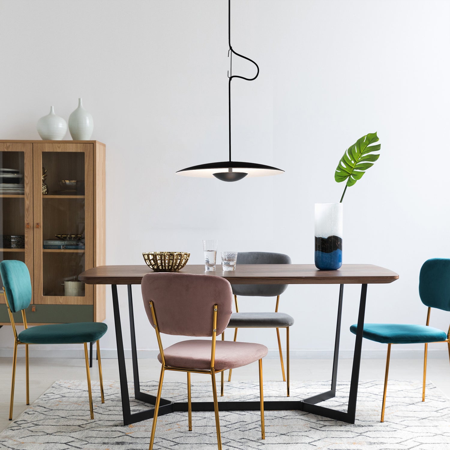 The Ginger Wood Pendant features a flying saucer design, showcasing a lampshade with a refined and natural wood grain pattern that exudes understated elegance.