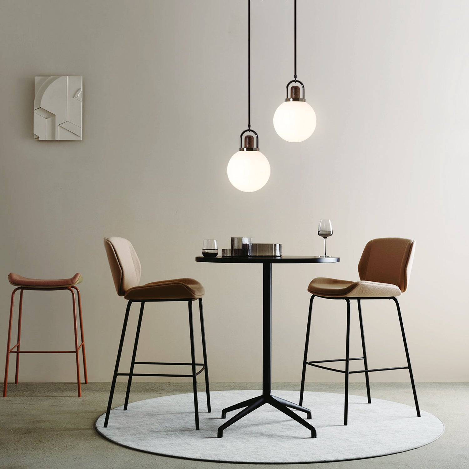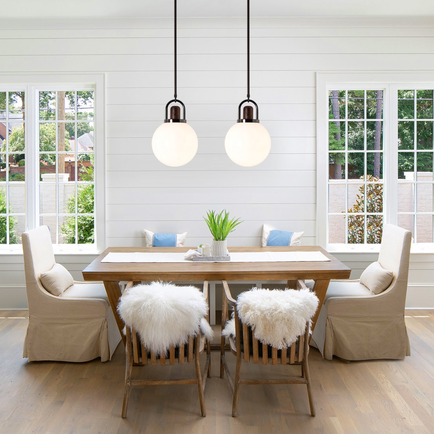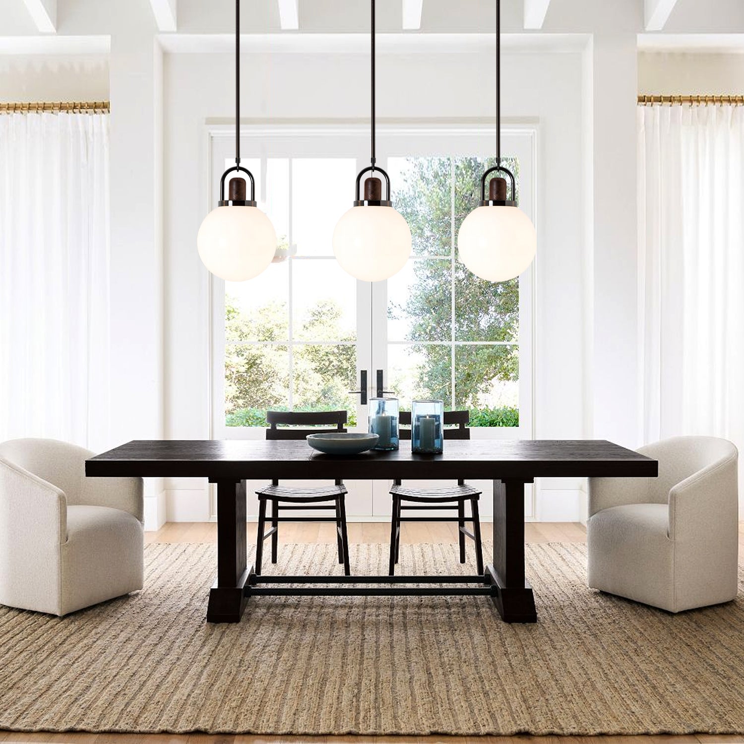 The Globe Pendant Light features a spherical glass shade suspended from a metal fixture. Its simple form provides soft illumination suitable for dining areas, living rooms, or hallways. The clean design allows it to complement a variety of interior styles.