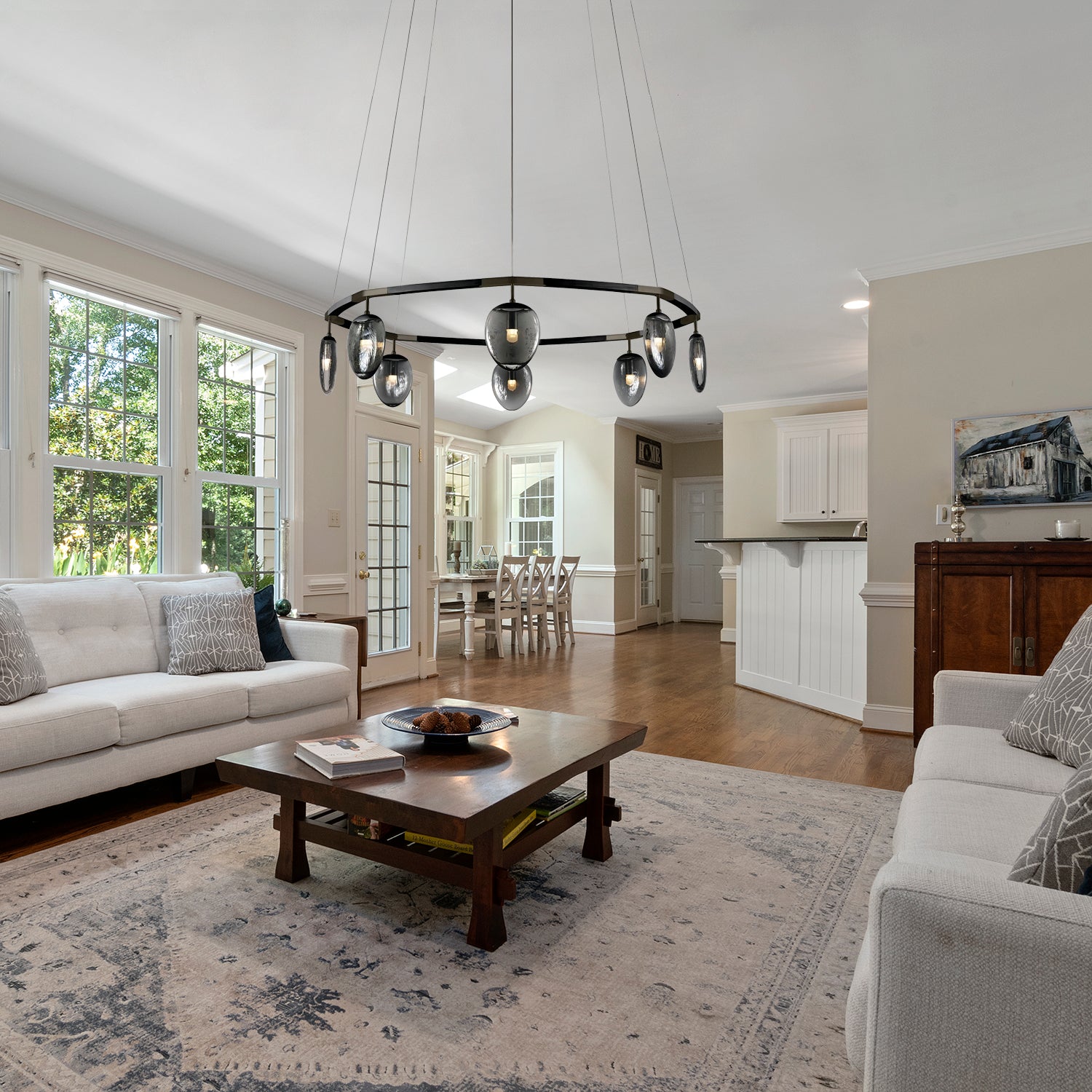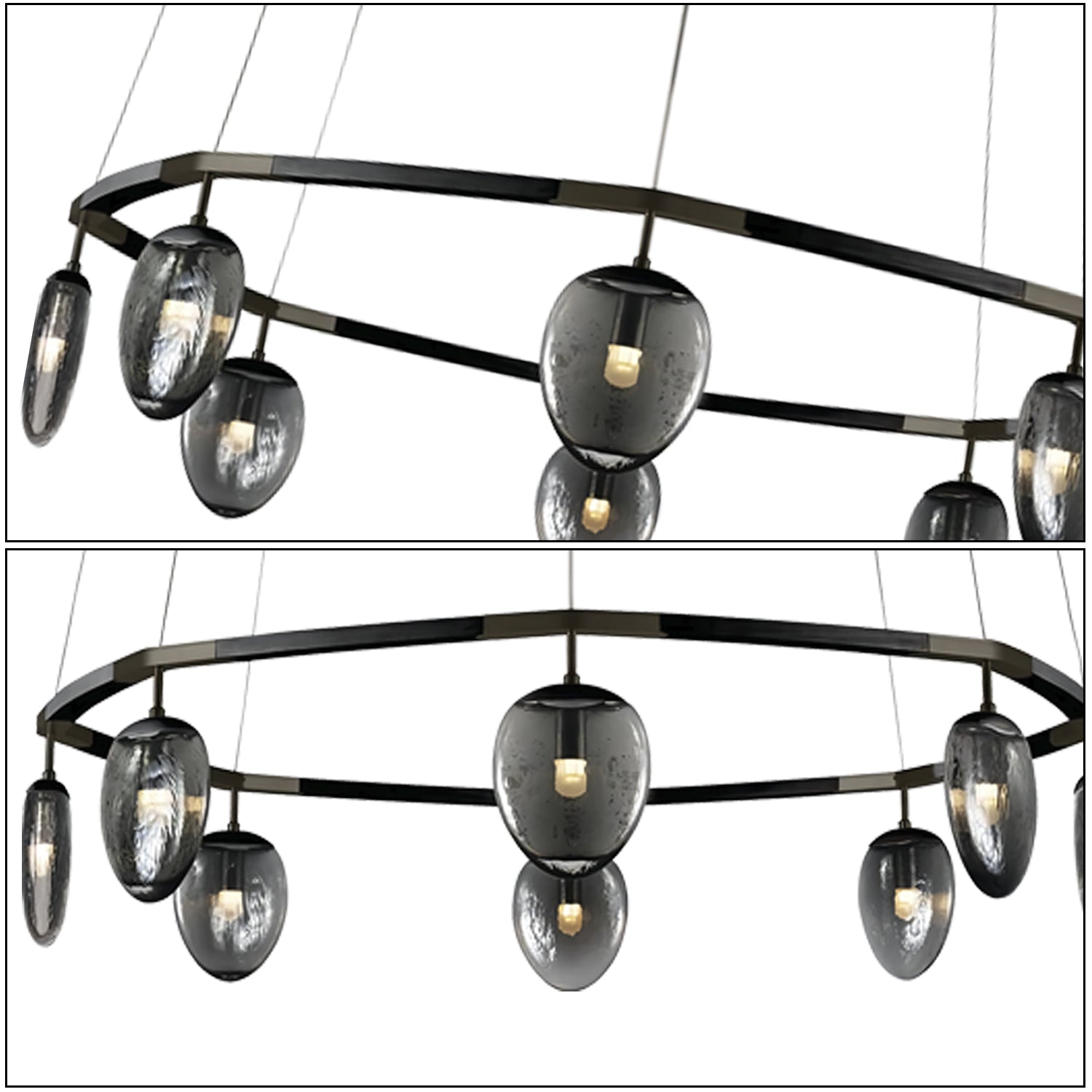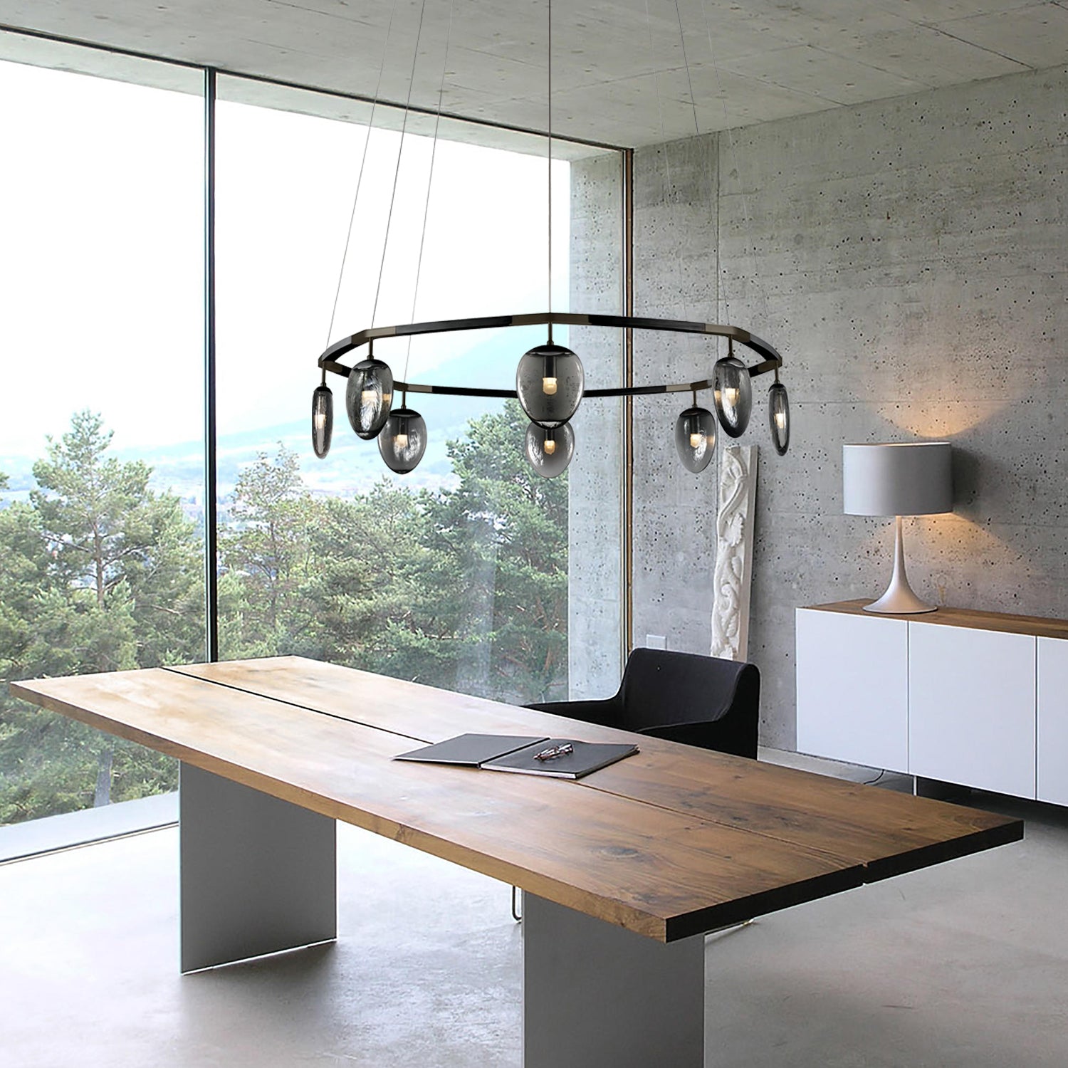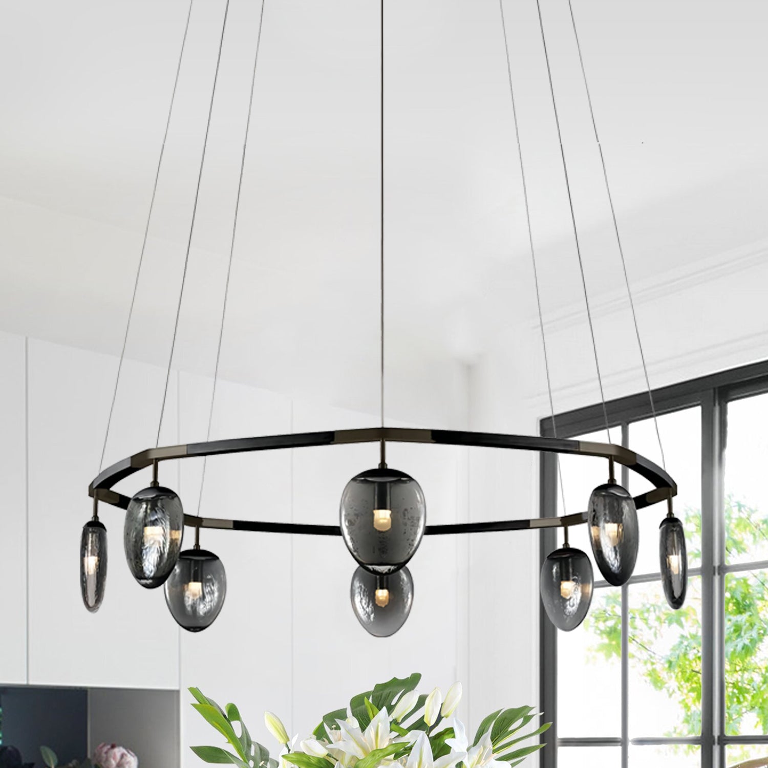 The Leaf Oval Ring Chandelier features multiple oval-shaped glass shades arranged in a circular metal frame. Each shade provides diffused lighting, creating an even distribution of light across the space. This fixture is suitable for dining rooms, living areas, or open spaces in both residential and commercial interiors.