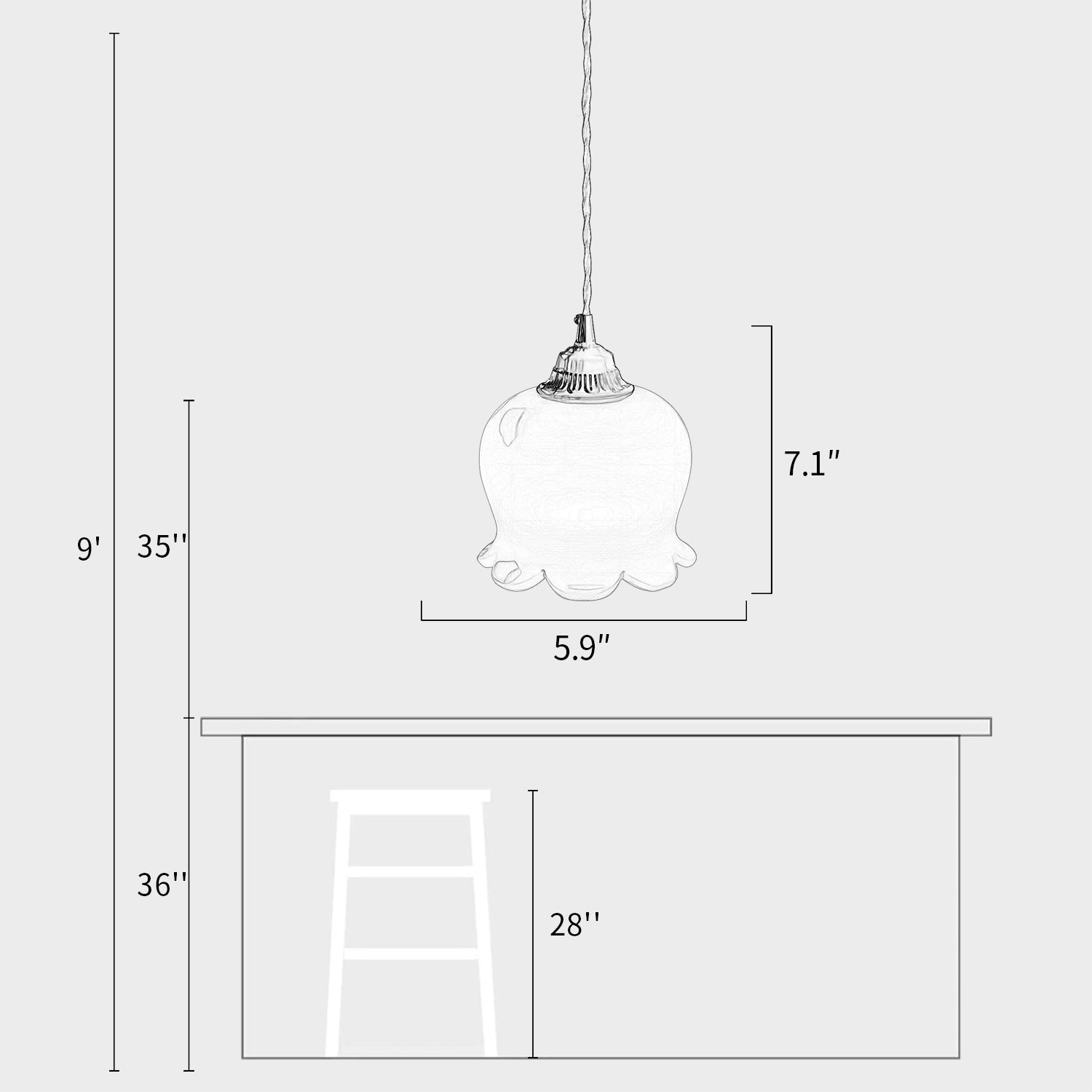 We provide 150 cm / 59 inches of hanging wire. It can be extended upon request.