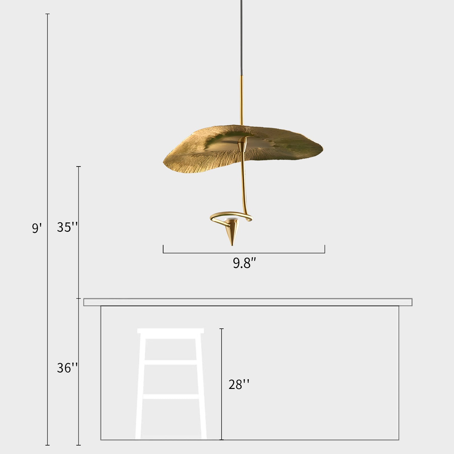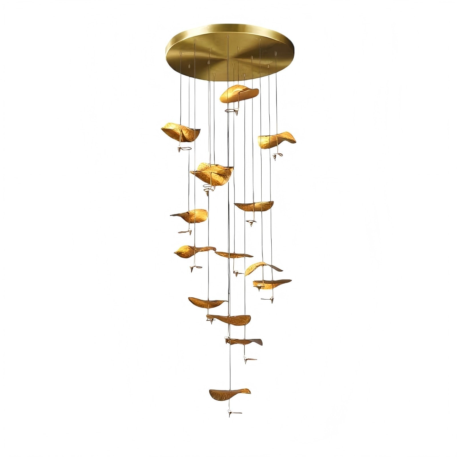 The Lotus Leaf Chandelier features suspended leaf-shaped elements arranged at different heights. The warm-toned finish adds a decorative touch and creates a gentle lighting effect. This ceiling fixture is suitable for living rooms, dining areas, or other indoor spaces and can complement a range of interior styles.