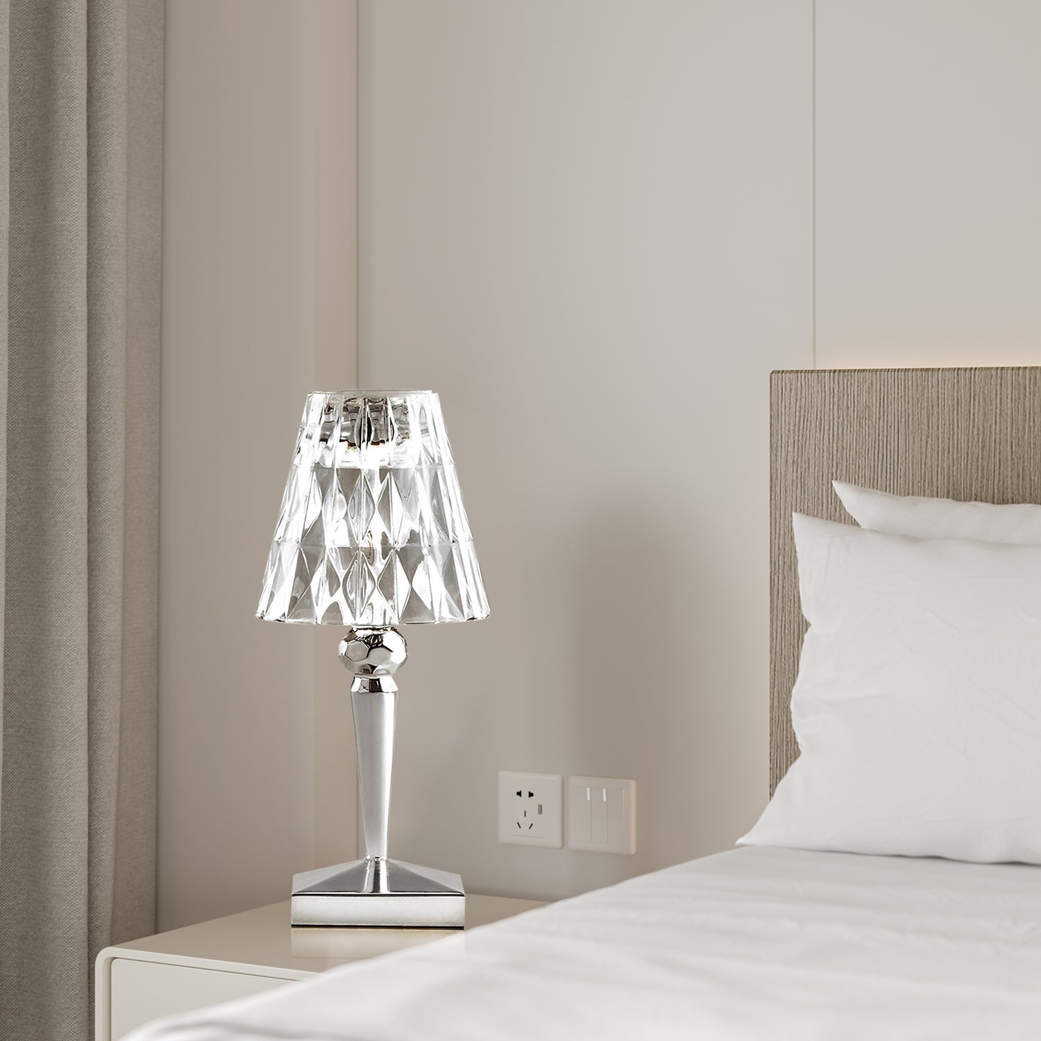 This Luminous Crystal Table Lamp features a shade crafted from small transparent plexiglass with sharp angles and a sleek, clear surface. Its design adds a distinctive ambiance to the space beside your bed.