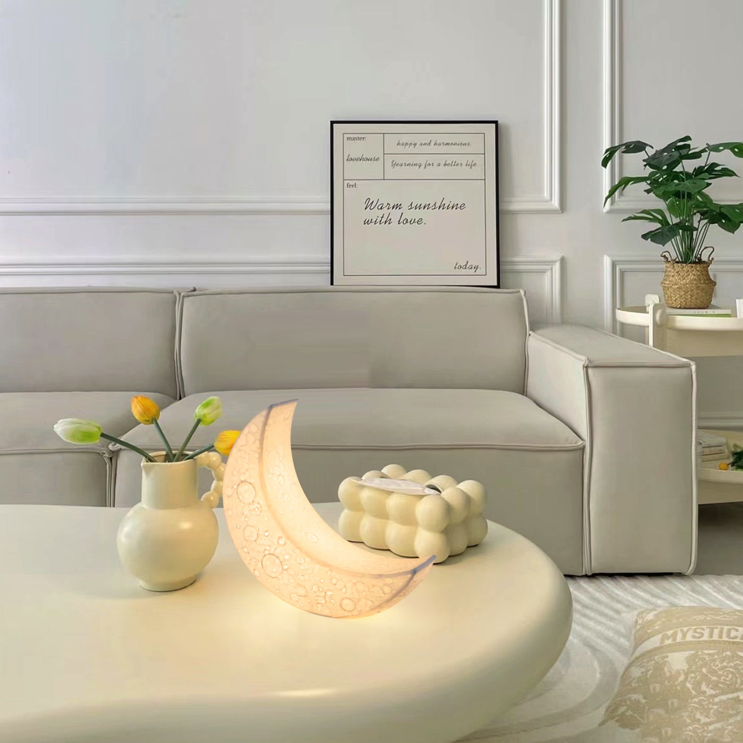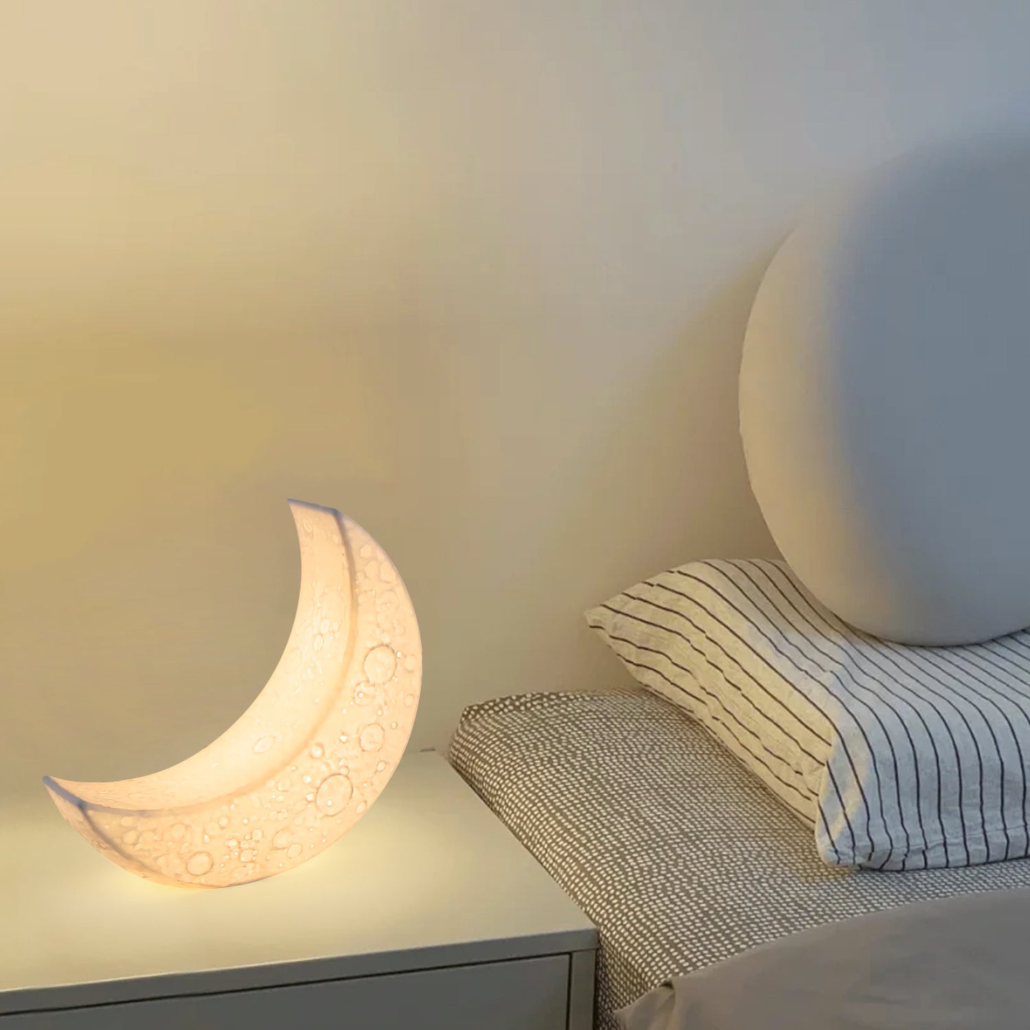 The MOON Table Lamp features a spherical design with a textured surface pattern resembling lunar details. Its shade is constructed from molded plastic composite. Emitting diffused ambient lighting through its shade. Suitable for use on bedside tables, desks, or living room side tables where soft indirect lighting is desired.