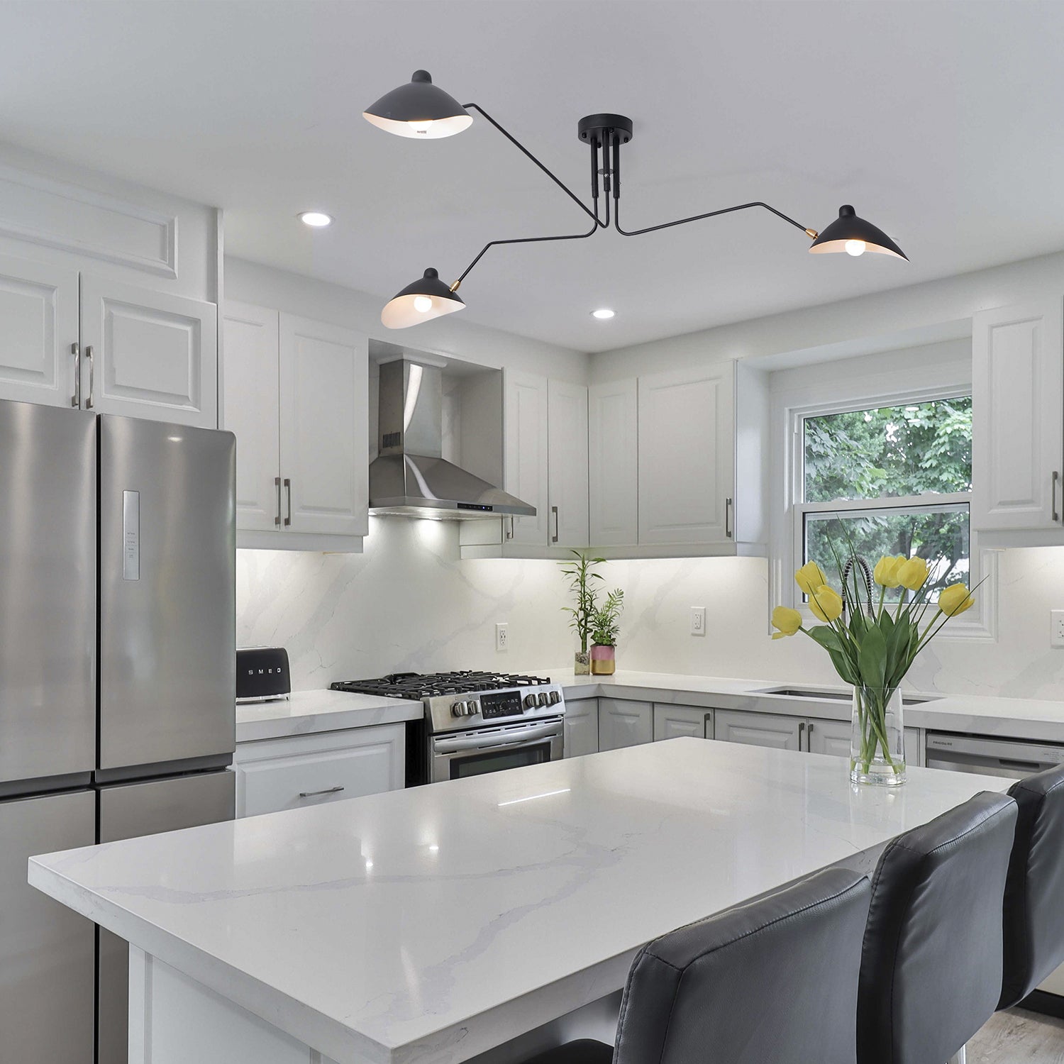 The Mouille Claws Ceiling Lamp is both beautiful and functional, with its angular insect design. Designed by Mouille himself, this lamp features adjustable shades and arms that rotate up to 300 degrees, allowing for both reflective and direct lighting. Illuminate any room with style and precision.