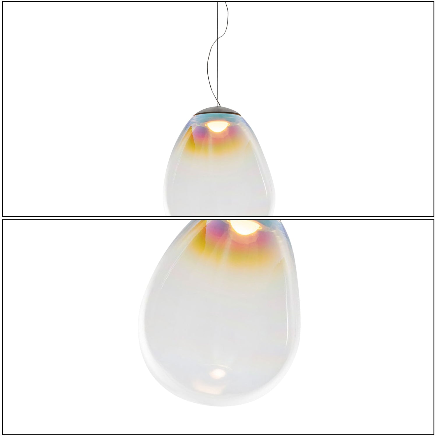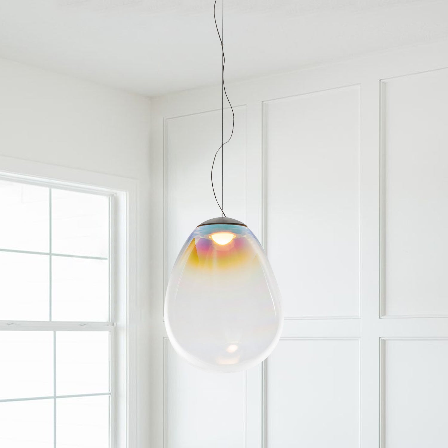 The Nebula Glass Pendant Light features a teardrop-shaped glass shade with an iridescent finish. The surface reflects subtle color variations when illuminated, while the light source is positioned at the top to create a downward glow. Designed for ceiling suspension, it is suitable for various indoor spaces.