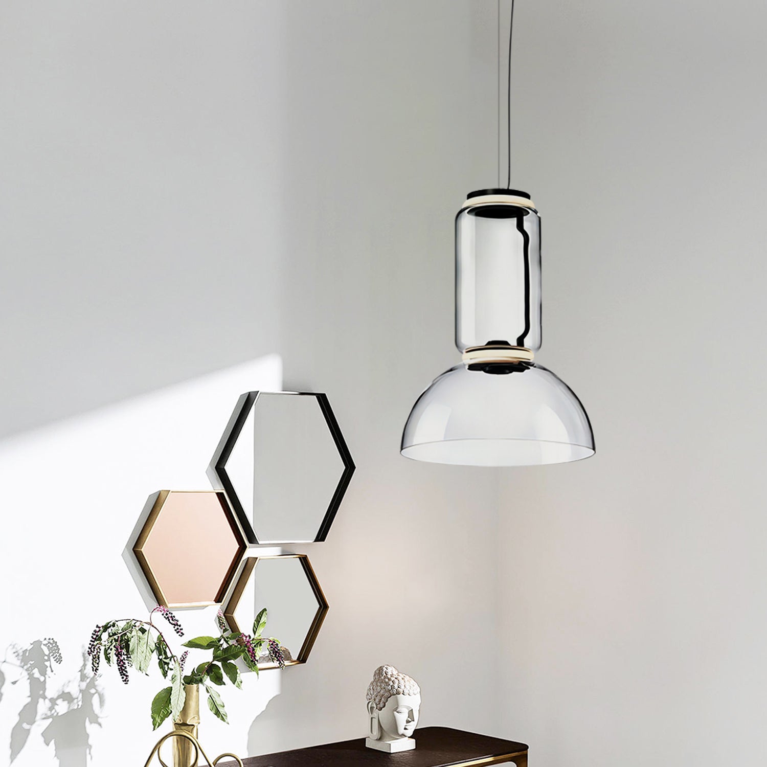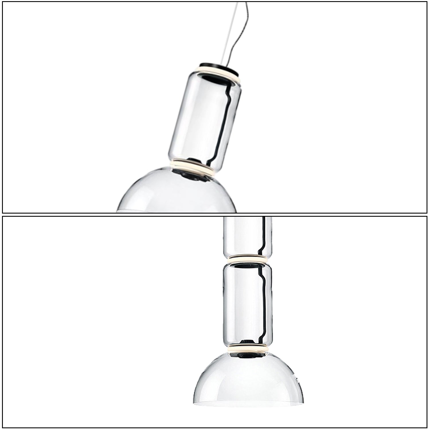 The Noctambule Glass Pendant Lamp features a clear glass body with a smooth, cylindrical form. Its minimalist design allows soft and balanced illumination, suitable for dining rooms, living areas, or modern interiors. The combination of glass and metal gives it a refined appearance while maintaining a simple aesthetic.