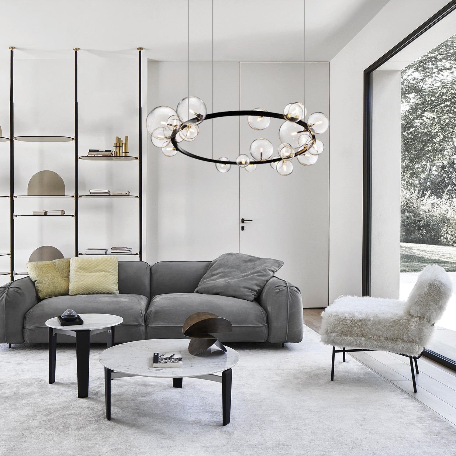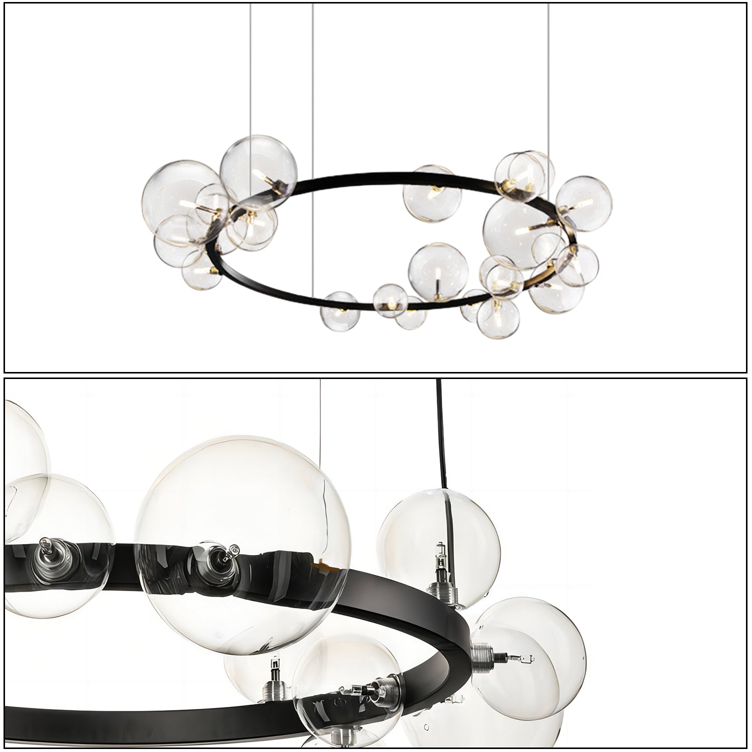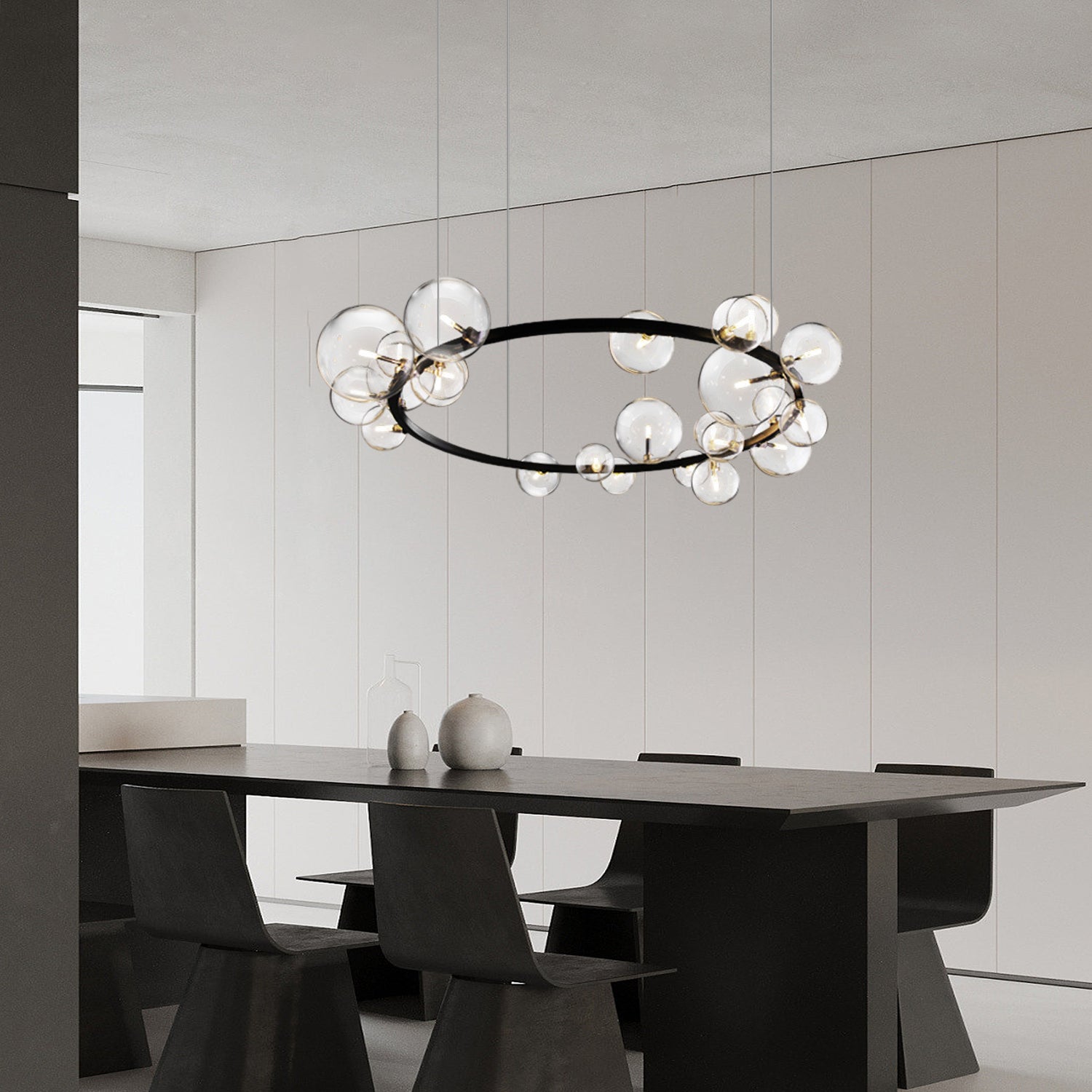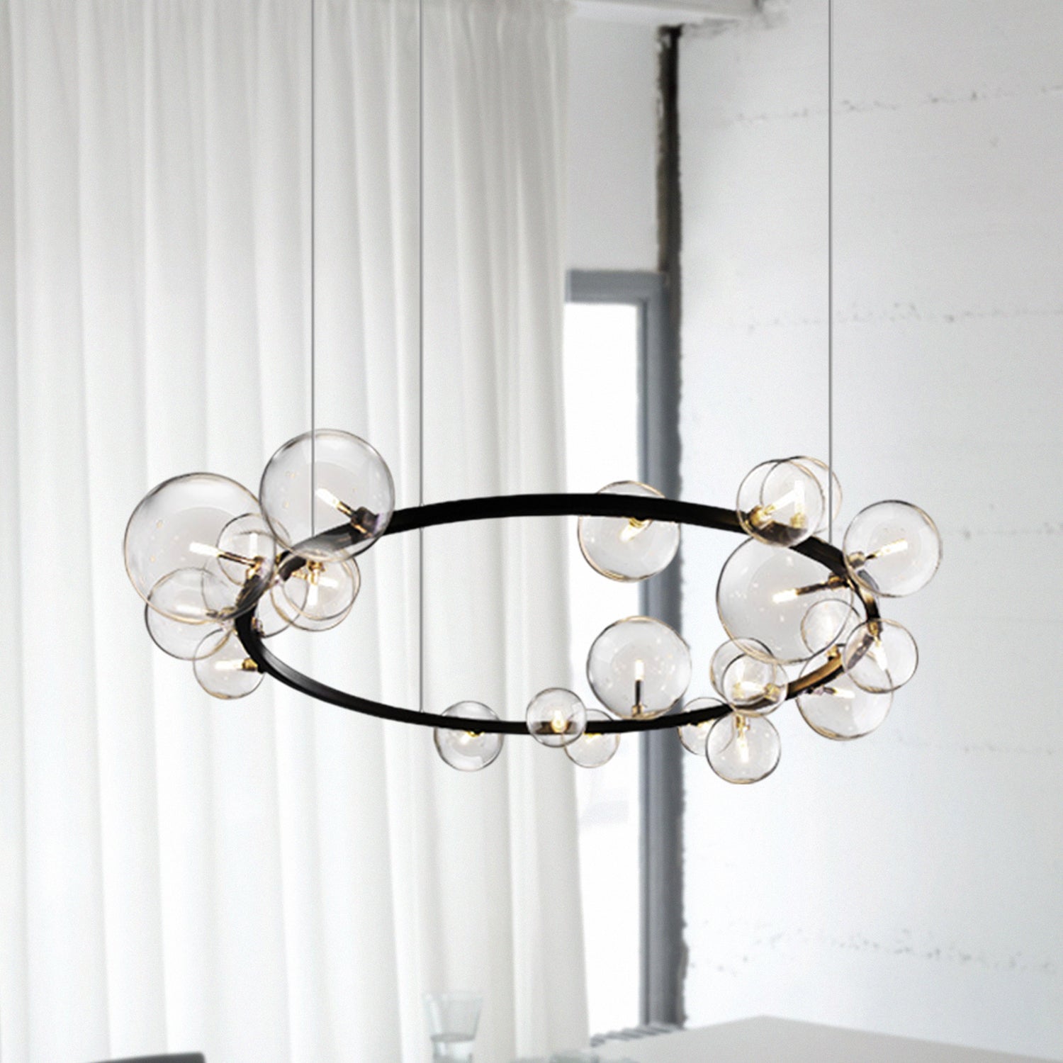 The Odeon Bubbles Ring Chandelier features a circular metal frame with clear glass globes. The glass globes are arranged around the ring to diffuse light evenly. Its modern design makes it suitable for living rooms, dining areas, or bedrooms, providing a balanced lighting effect.