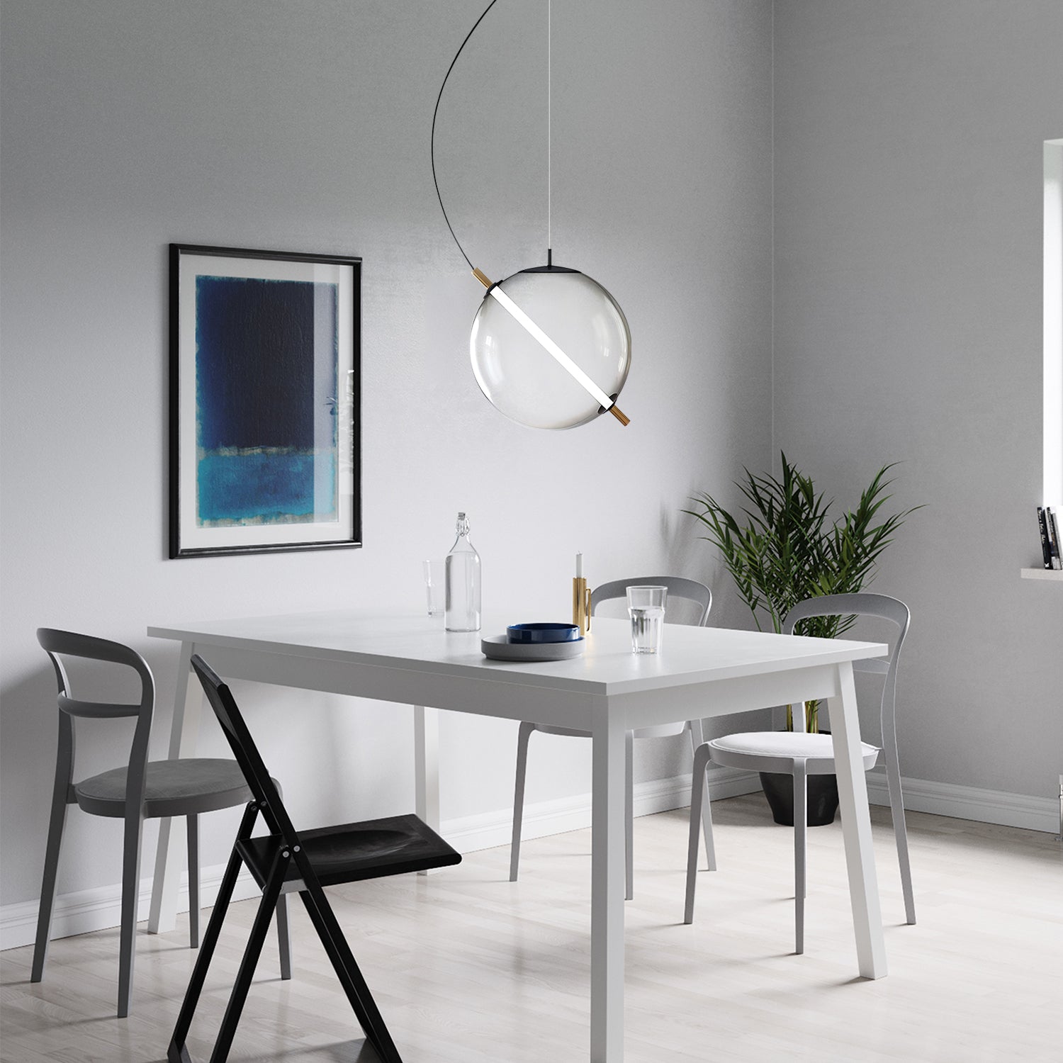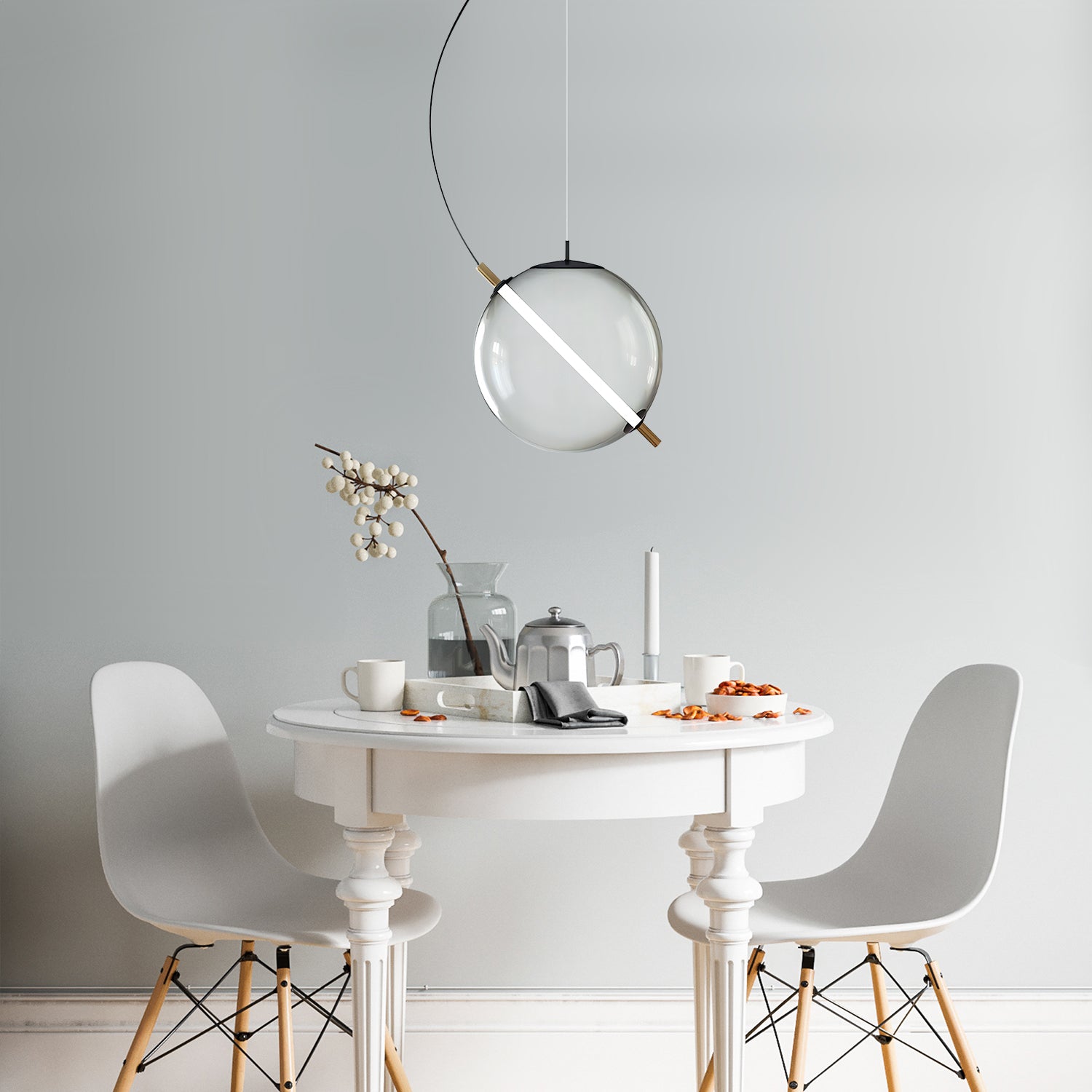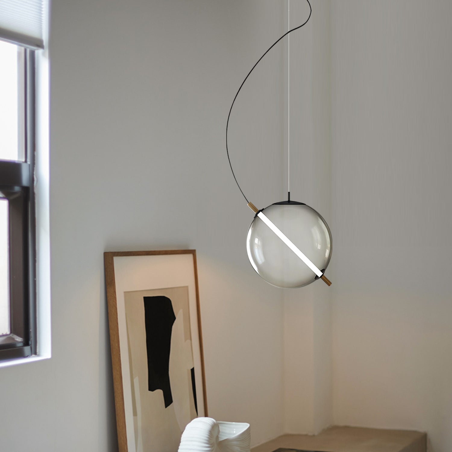 The Otto Glass Pendant features a clear spherical glass shade with a simple linear light element running through the center. Its balanced design offers soft illumination suitable for dining areas, living rooms, or offices. Made with quality glass and metal components, this pendant provides functional lighting with a clean, modern appearance.