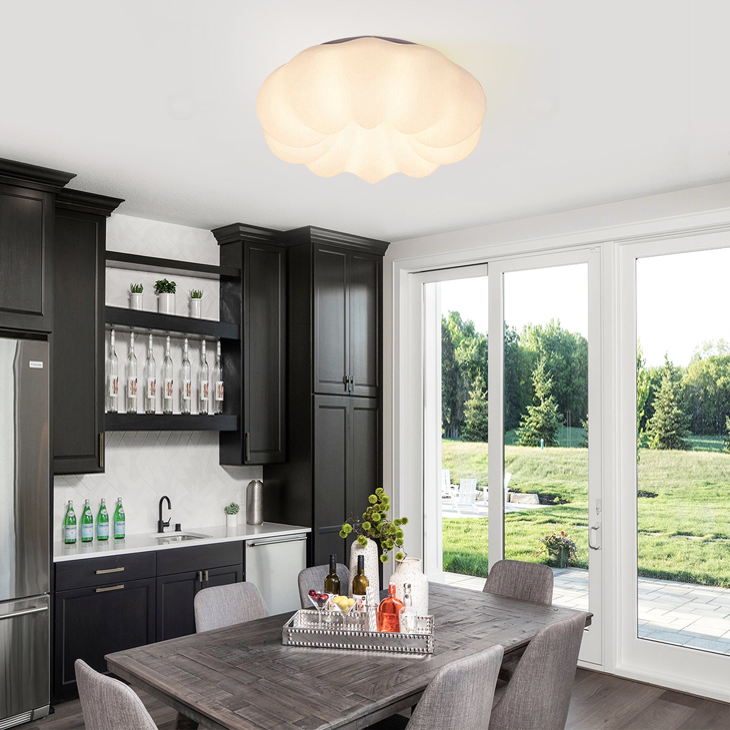 The Pumpkin Cloud Ceiling Light features a ceiling-mounted fixture with an organic form combining rounded cloud-like shapes. The shade is constructed from molded polymer material with a matte white finish. This fixture is designed to emitting diffused ambient light through the semi-opaque shade. Suitable for indoor residential spaces such as children's bedrooms, playrooms, or nurseries.