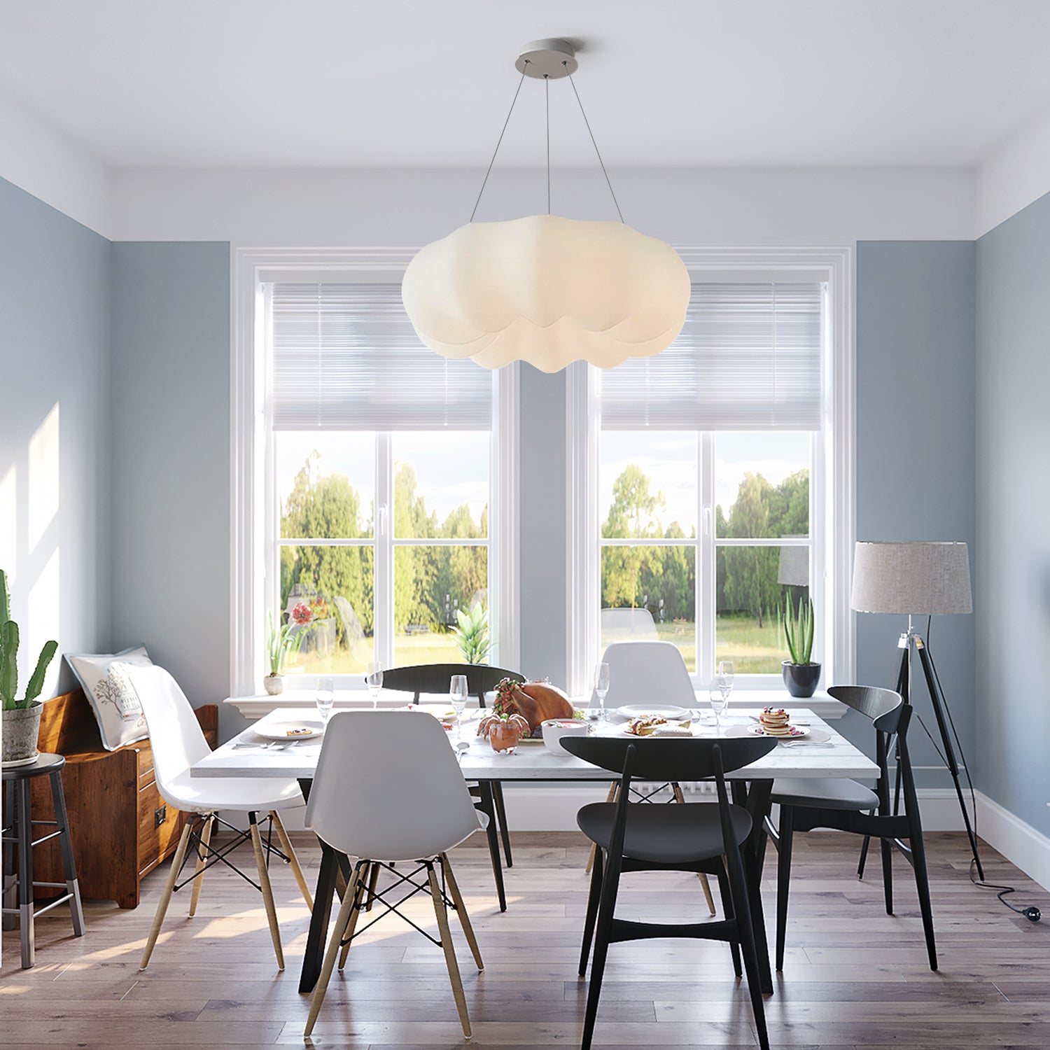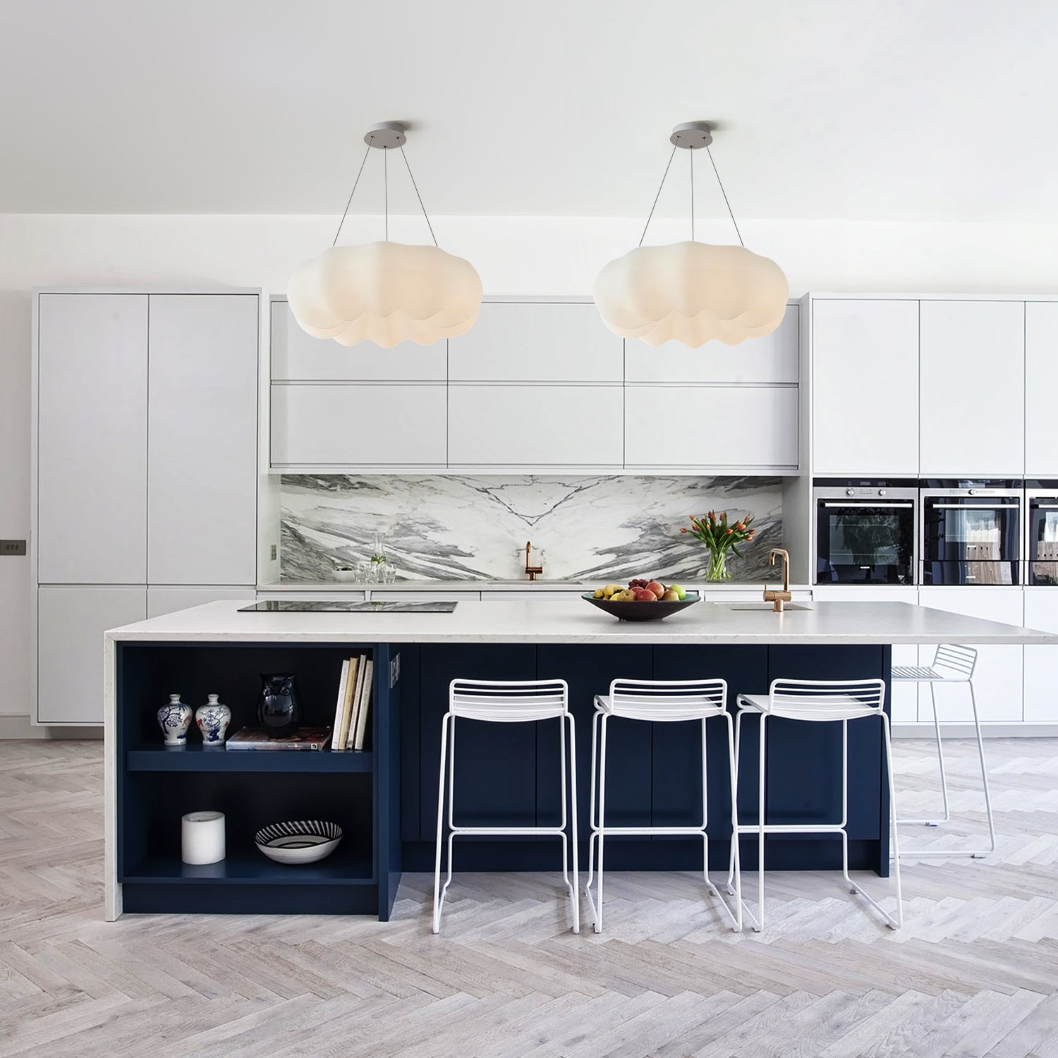 The Pumpkin Cloud Pendant Light features an organic form that combines rounded shapes. The shade is constructed from molded polymer material with a matte white finish. This pendant is designed to emitting diffused ambient light through its semi-opaque shade. Suitable for installation over dining tables, in bedrooms, or children's rooms.