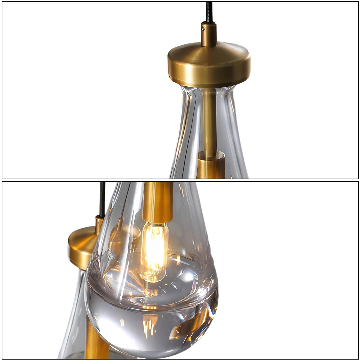 The Raindrop Glass Pendant Light features a series of clear glass shades shaped like water droplets, each suspended from a metal fitting. The design allows light to shine through the glass, creating a soft, downward illumination. Suitable for dining areas, living rooms, or entryways.