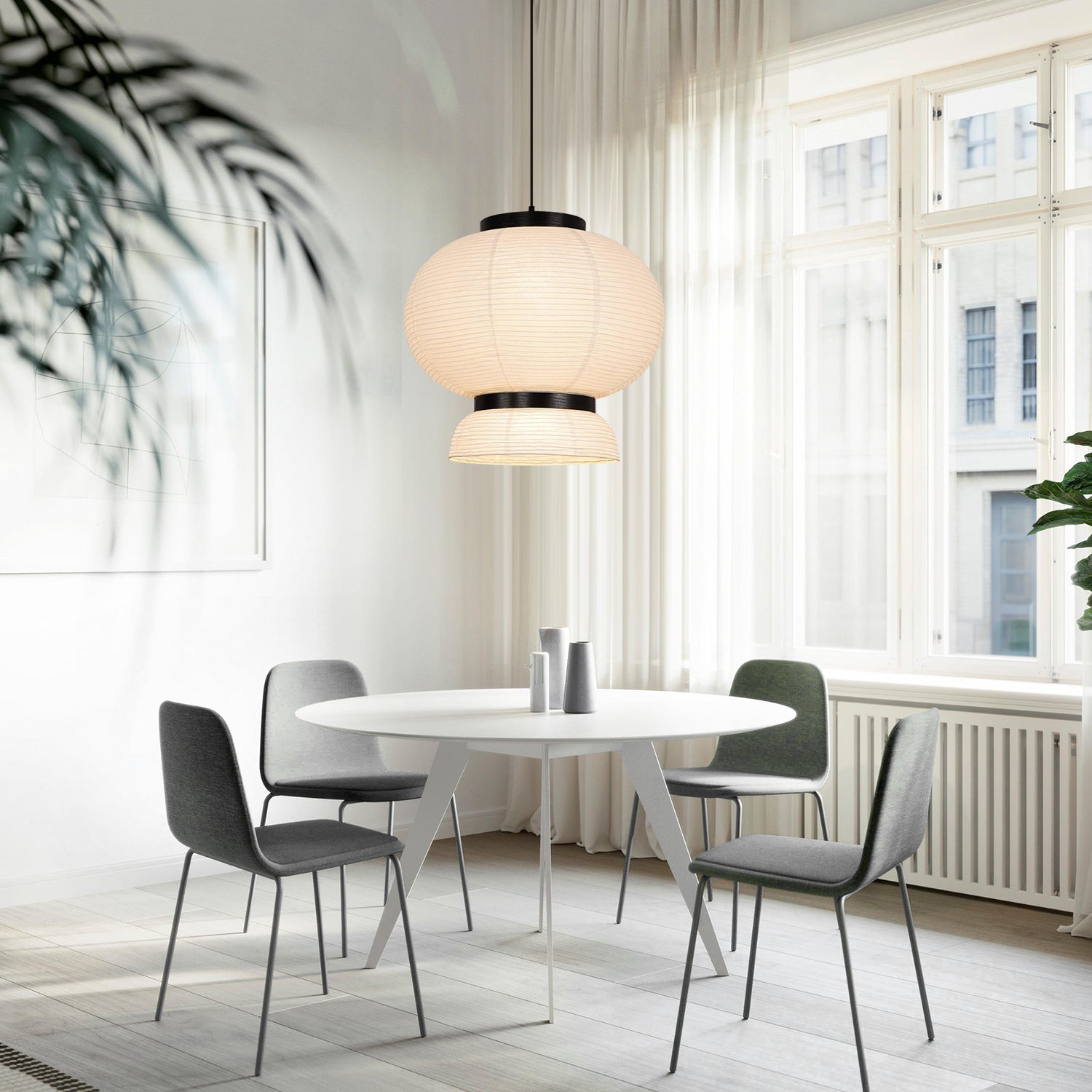 The Rice Paper Pendant Light is a modern interpretation of the classic Asian paper lantern. Combining Western and Eastern design concepts, a series of pure white lamps have been designed. The ivory white lampshade is handcrafted from rice paper, and the black oak frame outlines the concise outline. The ancient lanterns begin to rejuvenate the traditional aesthetic characteristics. The hand-made rice paper is used as a coat to ensure the toughness of the lampshade when it is supported. At the same time, the white rice paper has good light transmittance and can project more light without the light source.