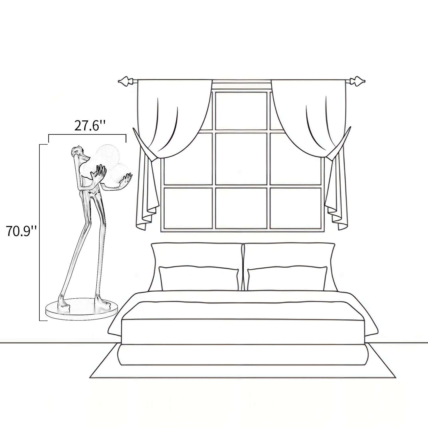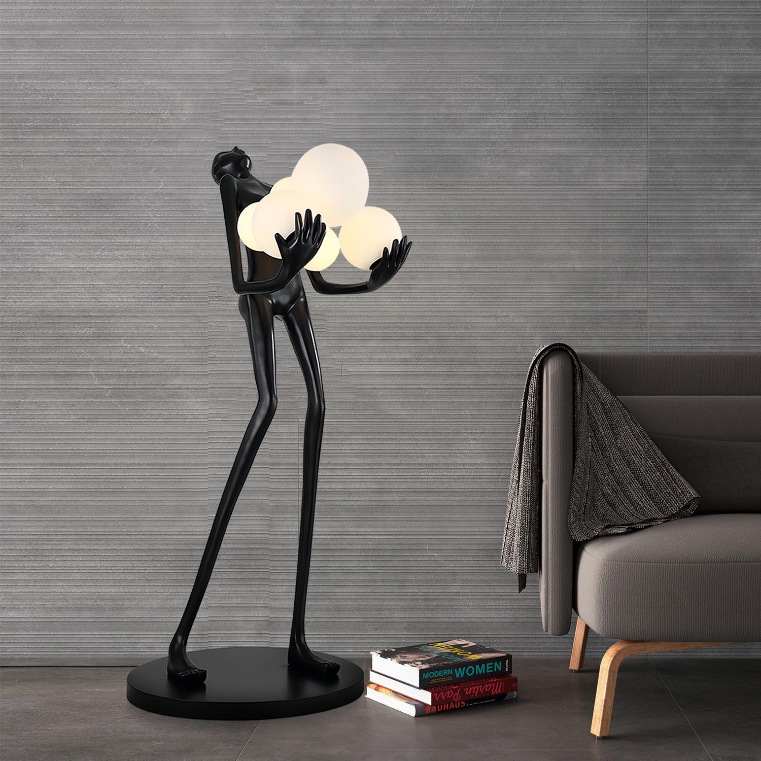 The Sculpture Floor Lamp features a human-shaped frame holding spherical glass shades. Made of metal and glass, it provides a balanced decorative element suitable for living rooms, lounges, or entryways.
