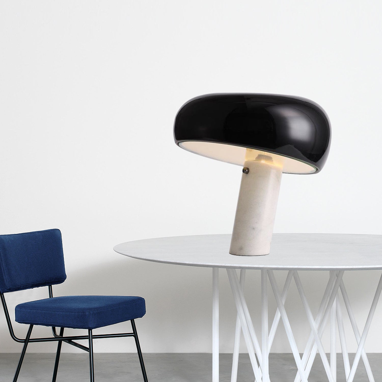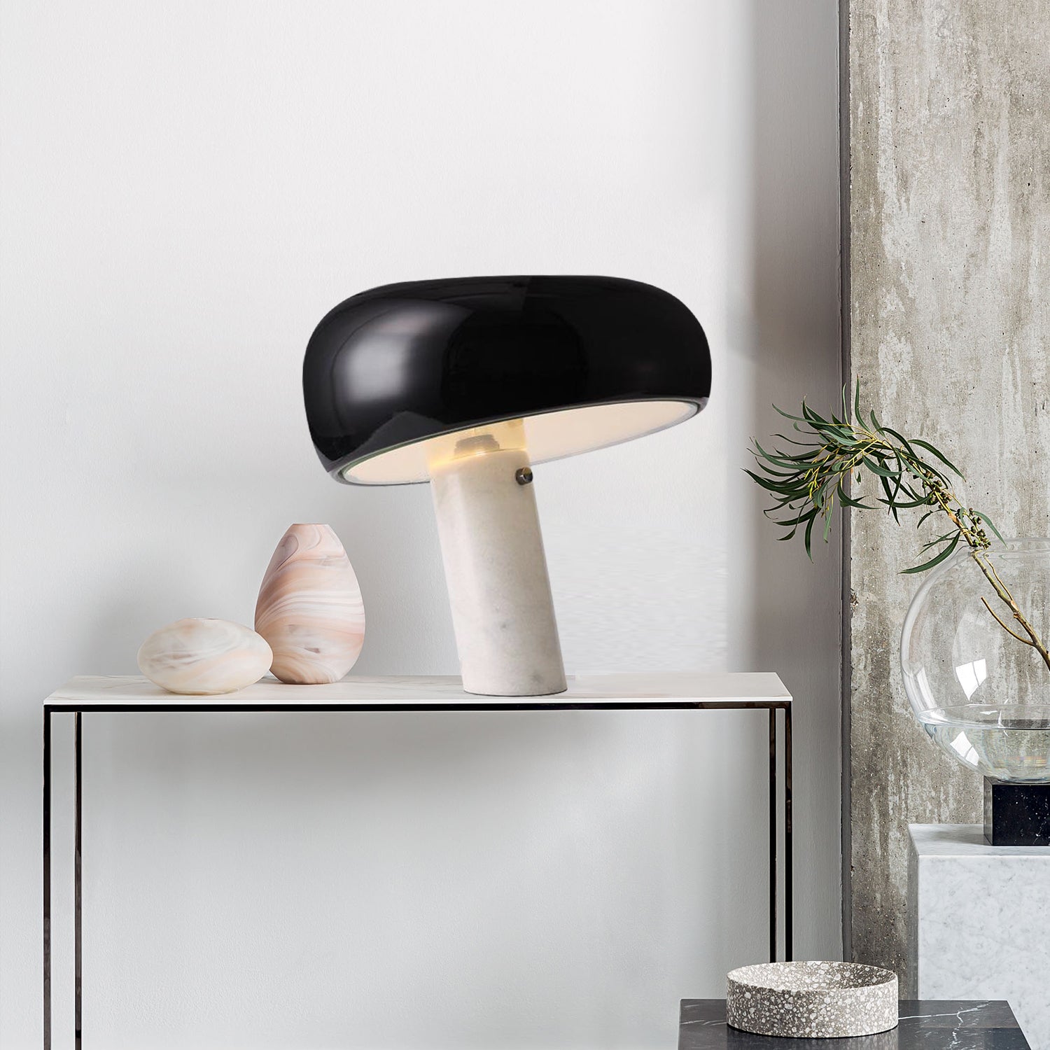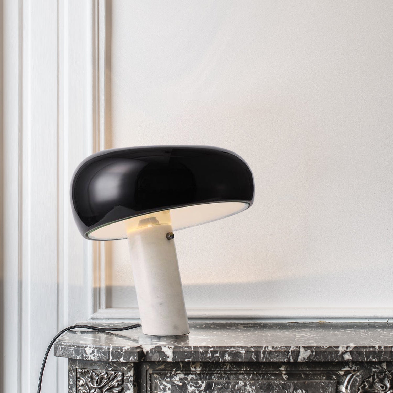 The Snoopy Glass Table Lamp takes design cues from the iconic Snoopy character, showcasing an egg-shaped glass shade atop a white marble cylindrical base. Its silhouette, reminiscent of a rounded mushroom cap, brings a whimsical yet sophisticated element to your space. The blend of gentle macaron tones with the natural marble foundation adds a subtle elegance and contemporary flair to any interior environment.