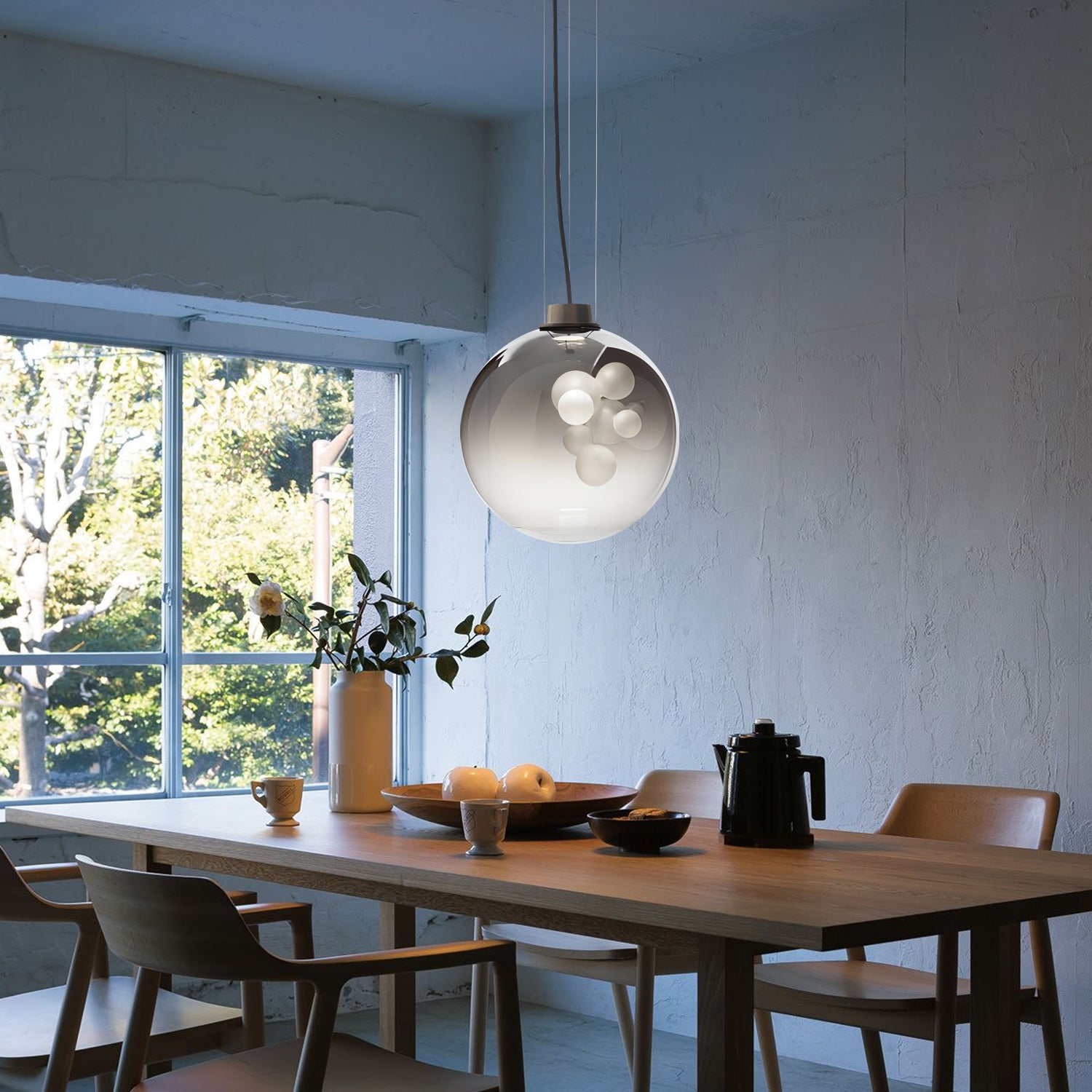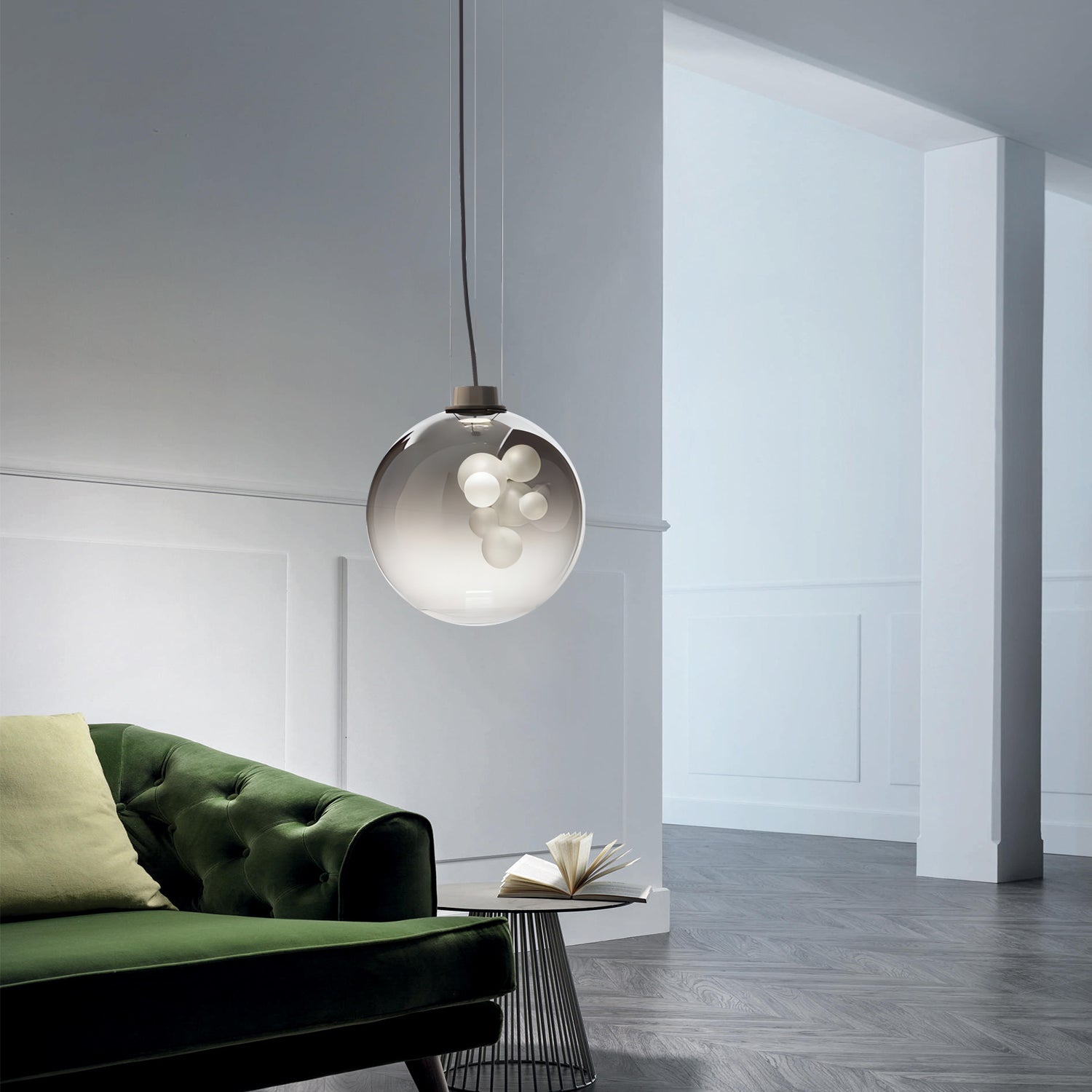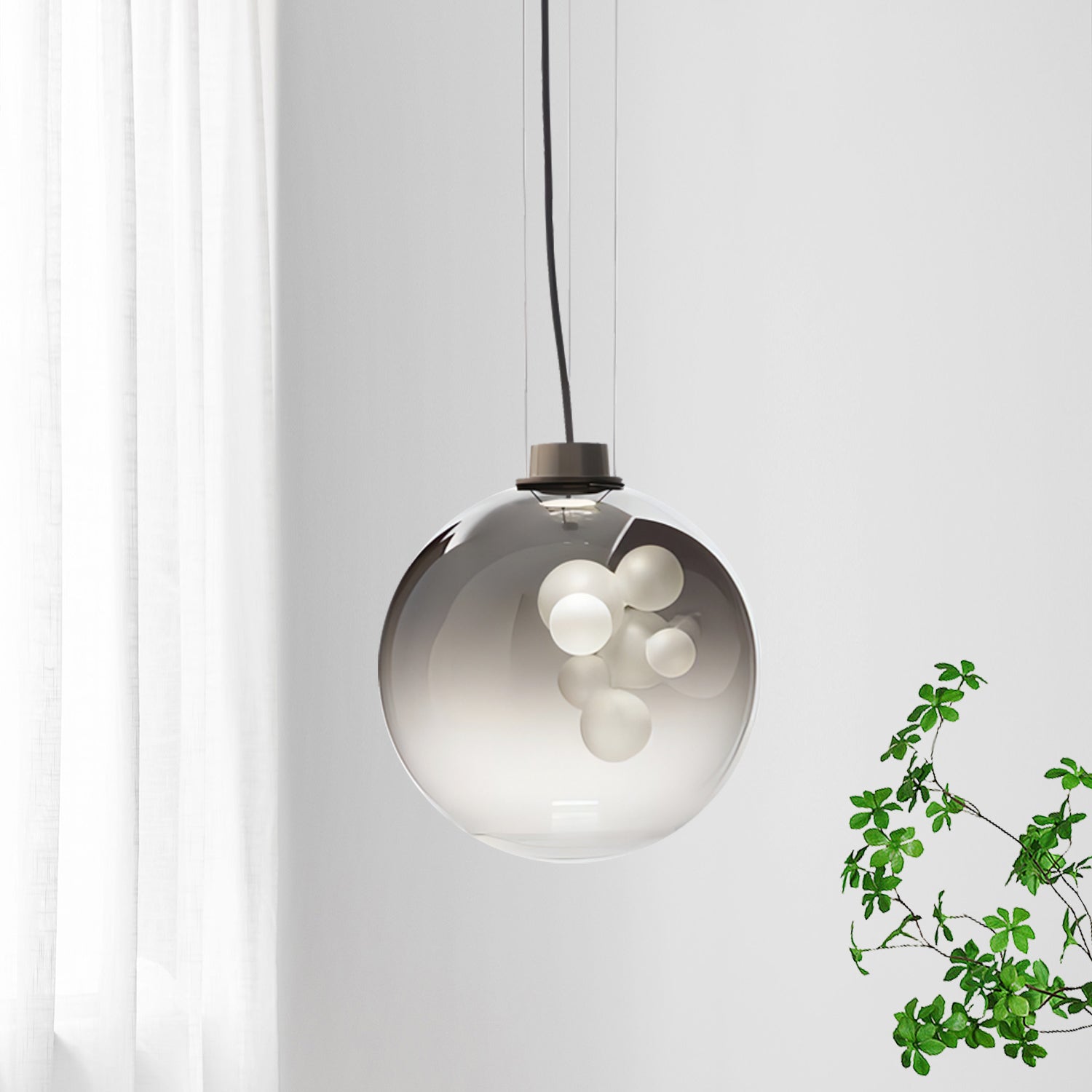 The Soap Sphere Pendant features a round glass shade with a soft gradient finish and a cluster of frosted bulbs inside. The design creates a gentle and balanced lighting effect suitable for living rooms, dining areas, or bedrooms.