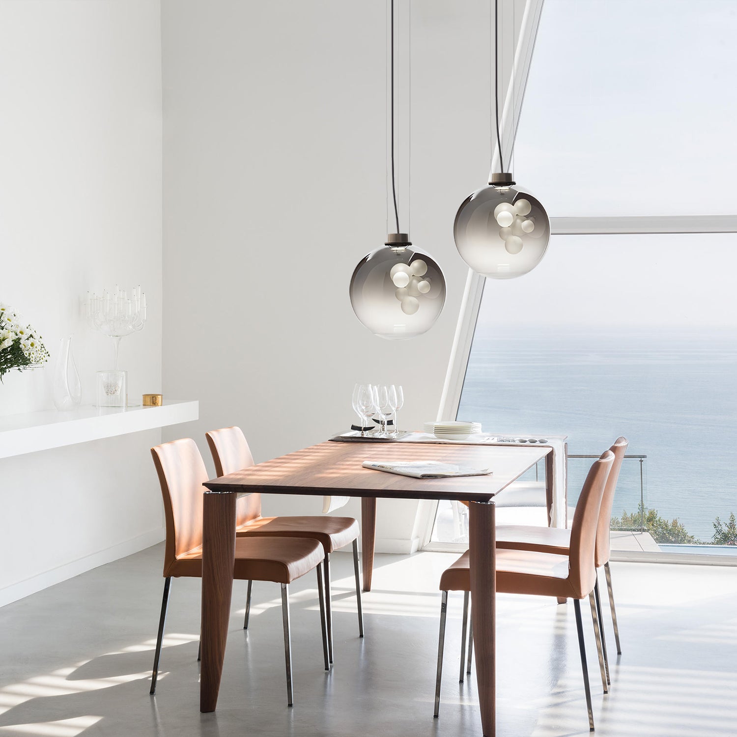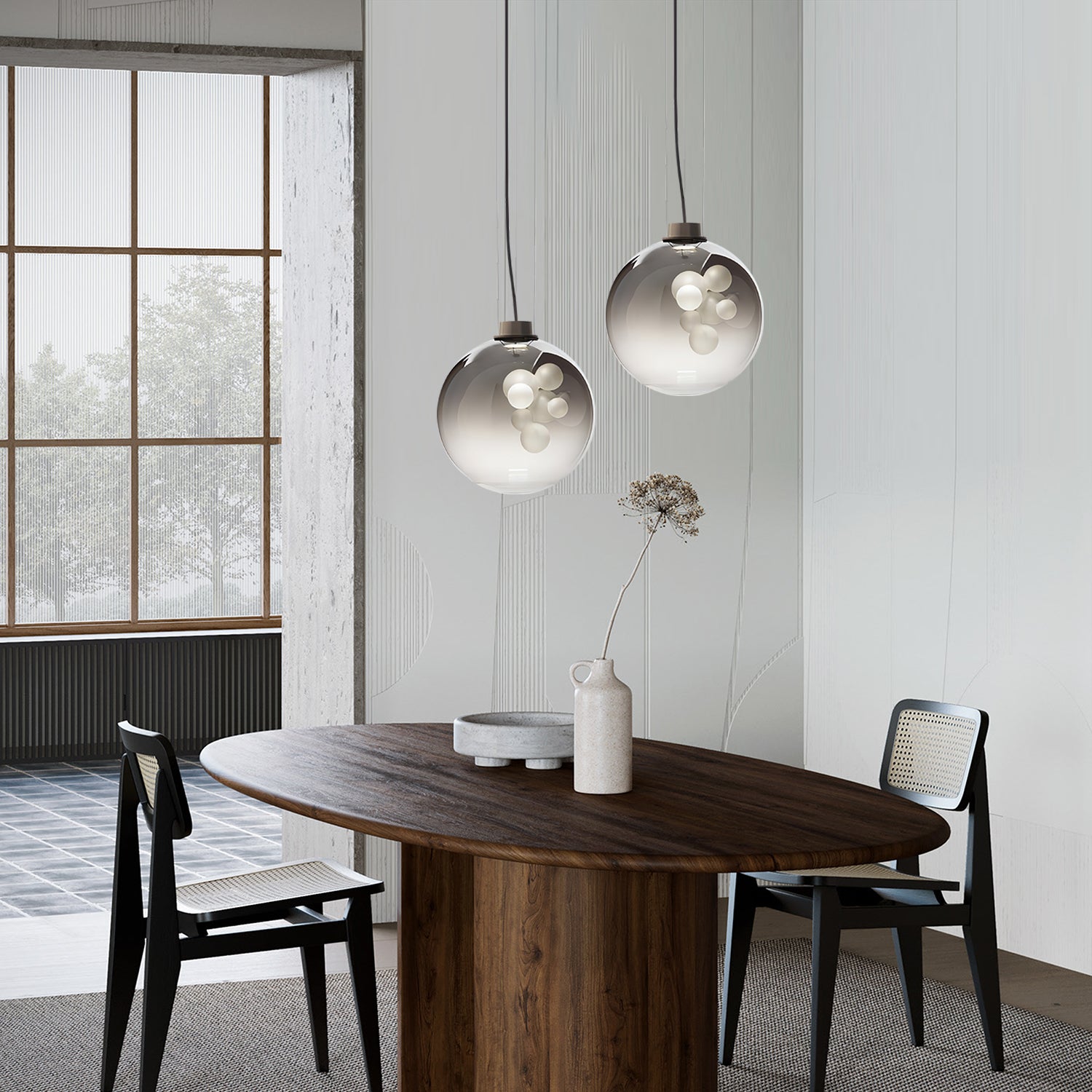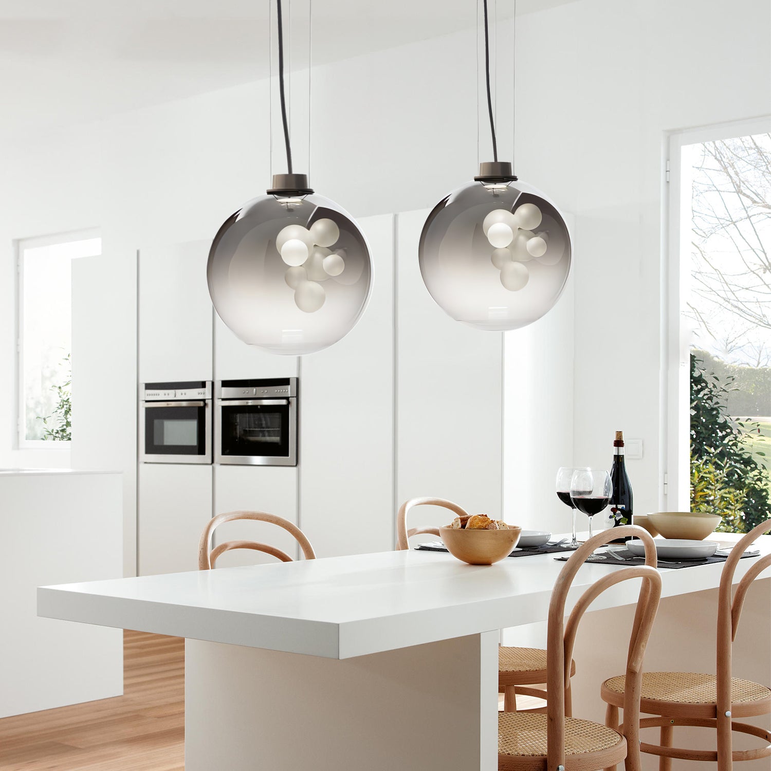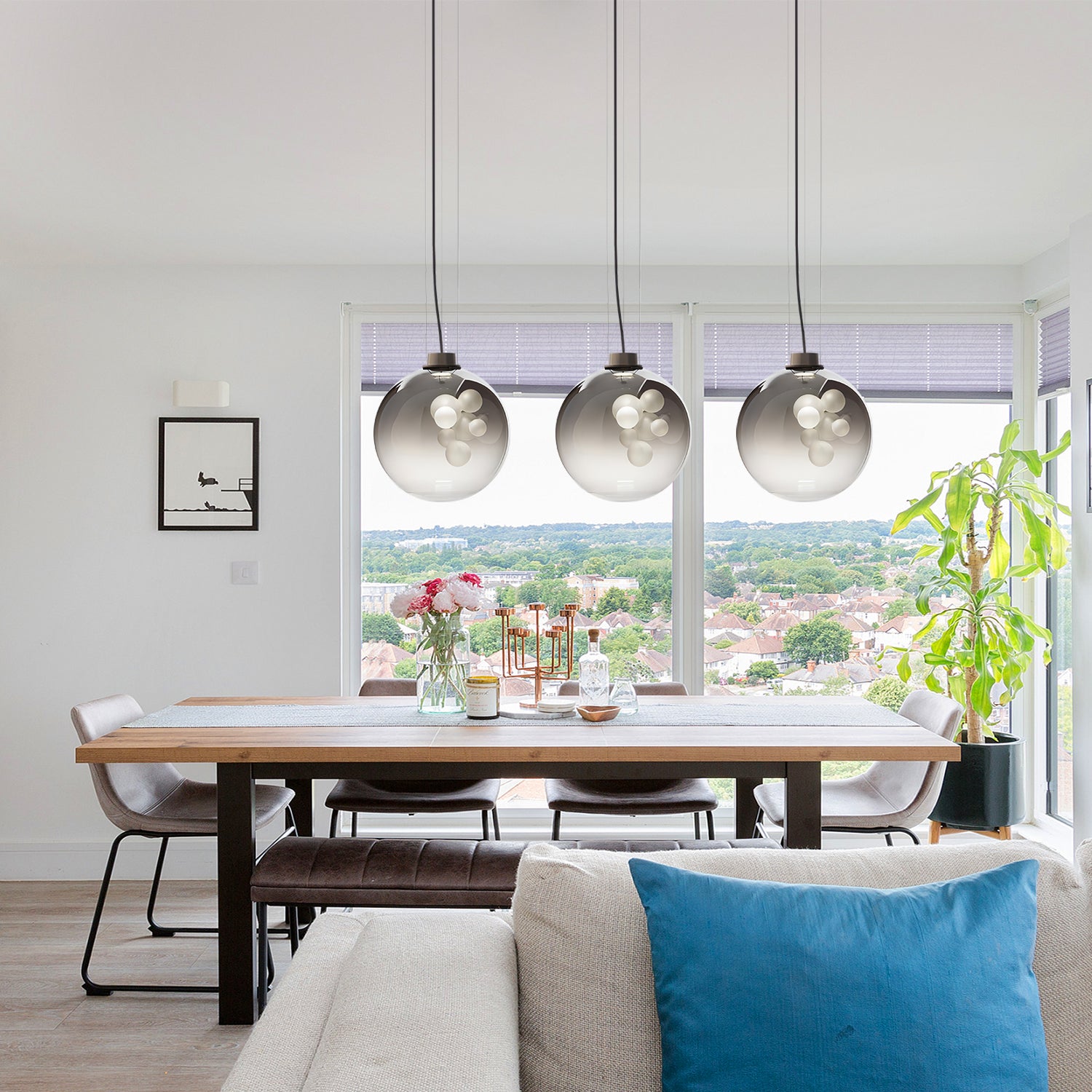 The Soap Sphere Pendant features a round glass shade with a soft gradient finish and a cluster of frosted bulbs inside. The design creates a gentle and balanced lighting effect suitable for living rooms, dining areas, or bedrooms.