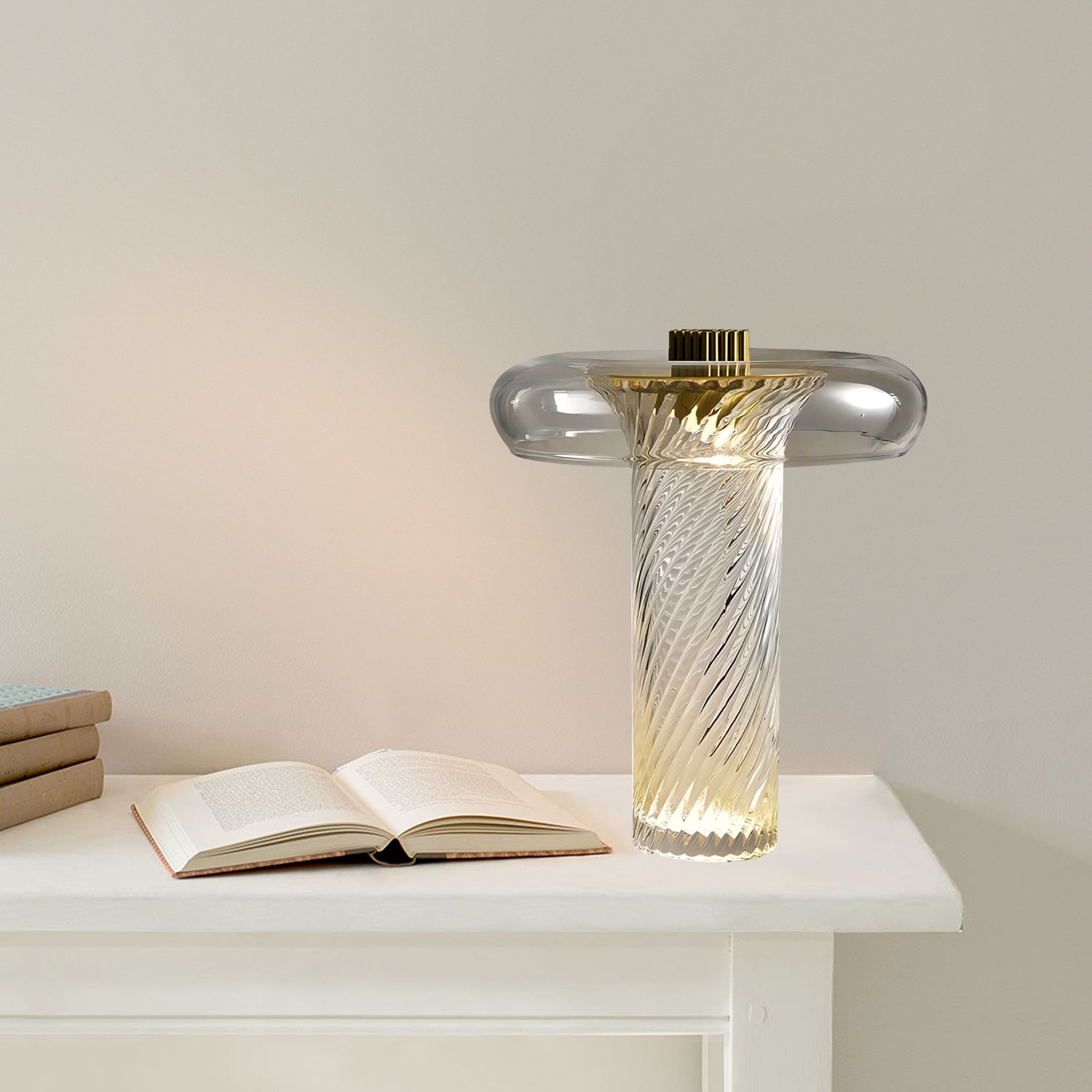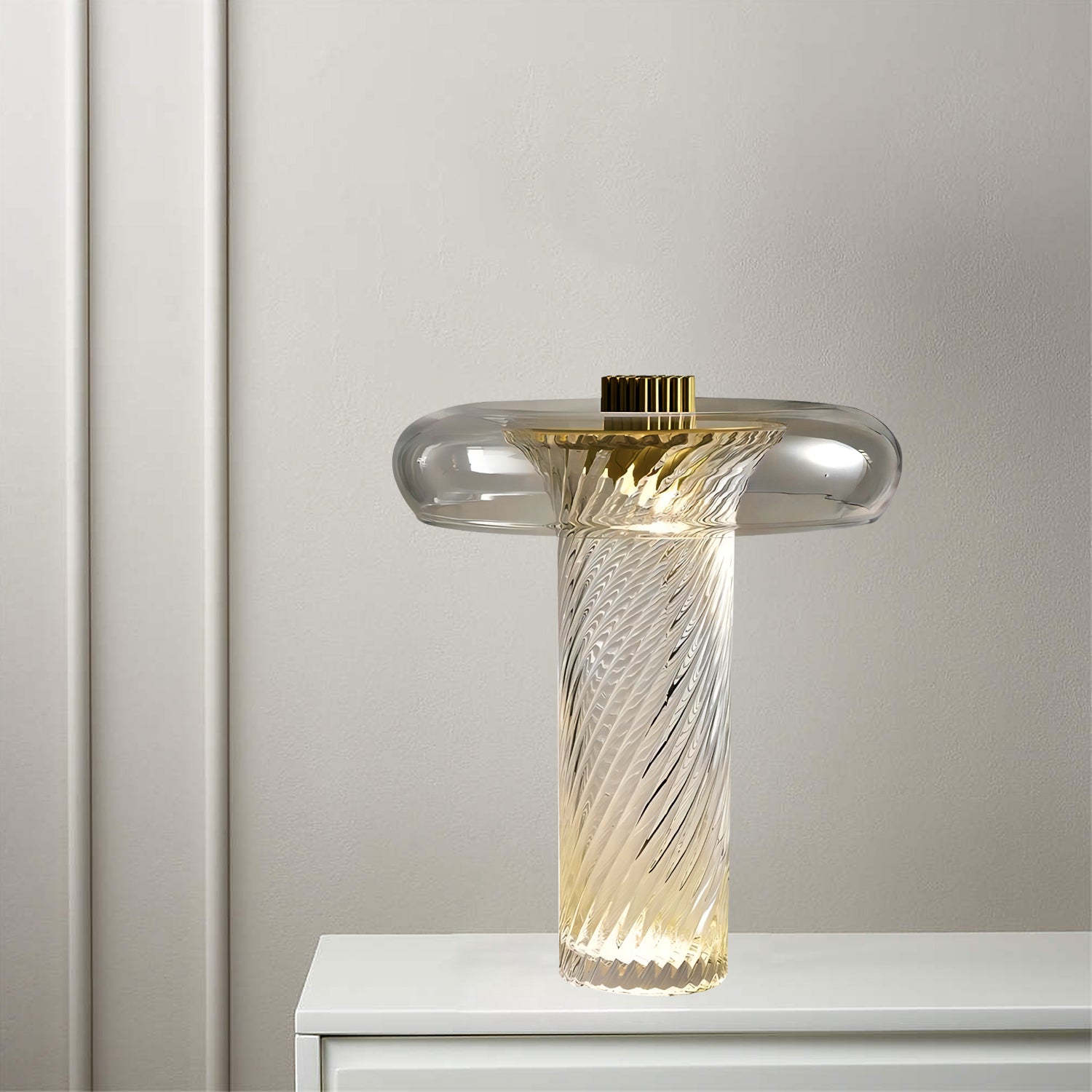The Stellar Glass Table Lamp is one of a unique collection of glass lamps. It combines various vintage glass items with advanced LED lighting technology to form a new artwork. The optical beauty of refraction attracts and motivates us. Made of pure hand-blown glass, with a twist pattern light body, the light body can be placed small accessories. Feel the transparent beauty of glass.