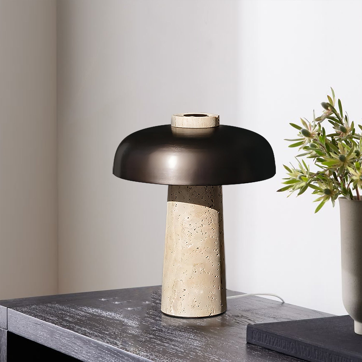 Travertine Mushroom Table Lamp, is inspired by the play and appreciation of earth stone. A sculptural blend of natural travertine and aluminum metal. A unique tapered profile that exudes a rustic yet sophisticated aesthetic. Restore the beauty of the original nature, with an industrial character. The warm light source allows to create a pure and undisturbed Nordic natural style.