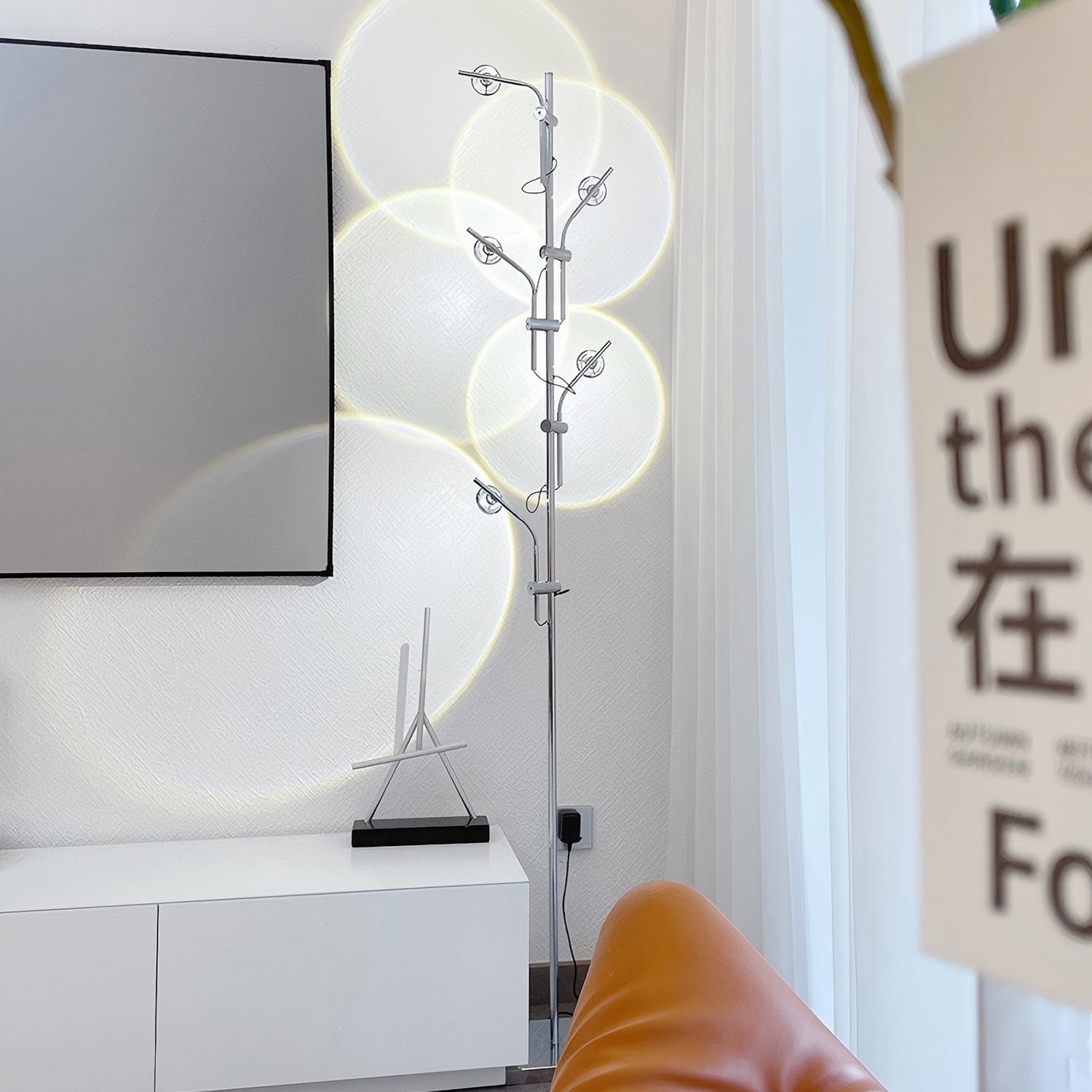 The Wa Floor Lamp features an electroplated chrome frame paired with a glass shade. Its adjustable lamp head allows for versatile lighting angles, delivering gentle illumination with layered light effects to enhance your living space.