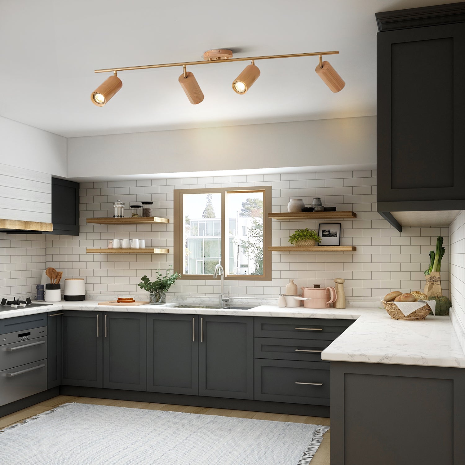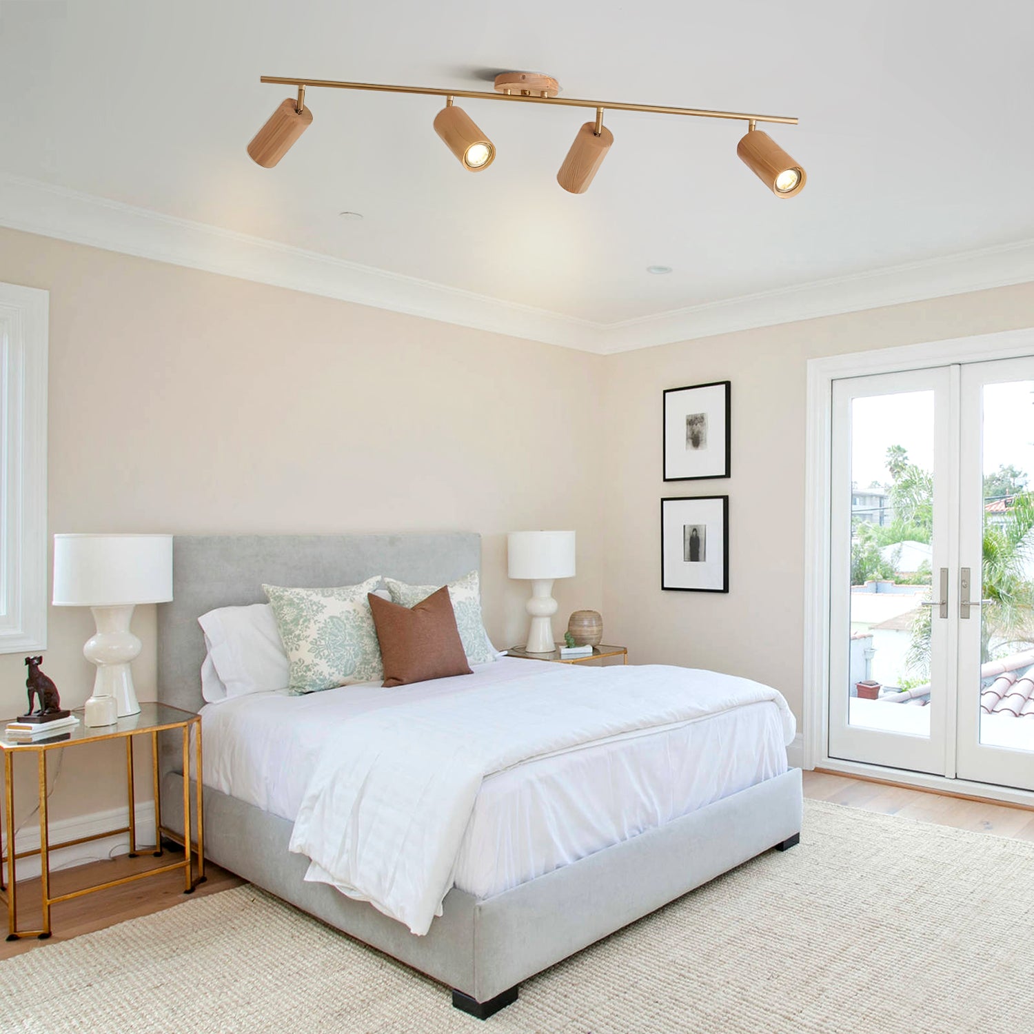 The Wood Spotlight Track Light features a metal frame with three cylindrical wooden shades. Each spotlight can be adjusted to direct light where needed. The combination of wood and metal offers a simple and natural look, suitable for living rooms, kitchens, or hallways. Designed for ceiling mounting, this light provides functional illumination with a straightforward style.